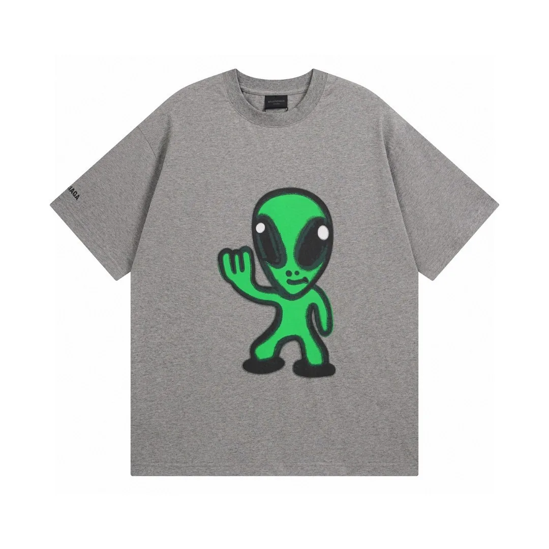 BALENCIAGA/Balenciaga SS-Kurzarm-T-Shirt mit Direktdruck, Alien-Motiv auf der Vorderseite und Smiley-Motiv auf der Rückseite.