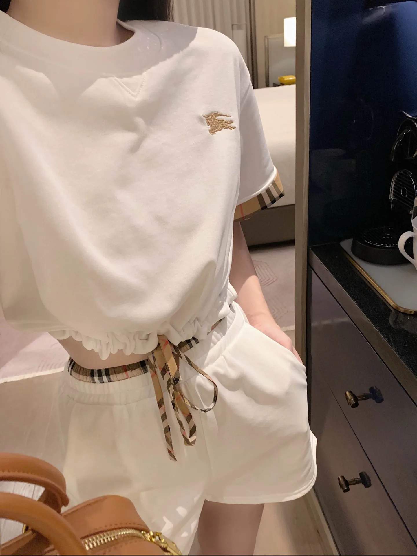 Burberry BBR Warhorse Set aus kurzärmligem Top mit Rundhalsausschnitt, Kordelzug und Shorts mit elastischem Bund und besticktem Karomuster