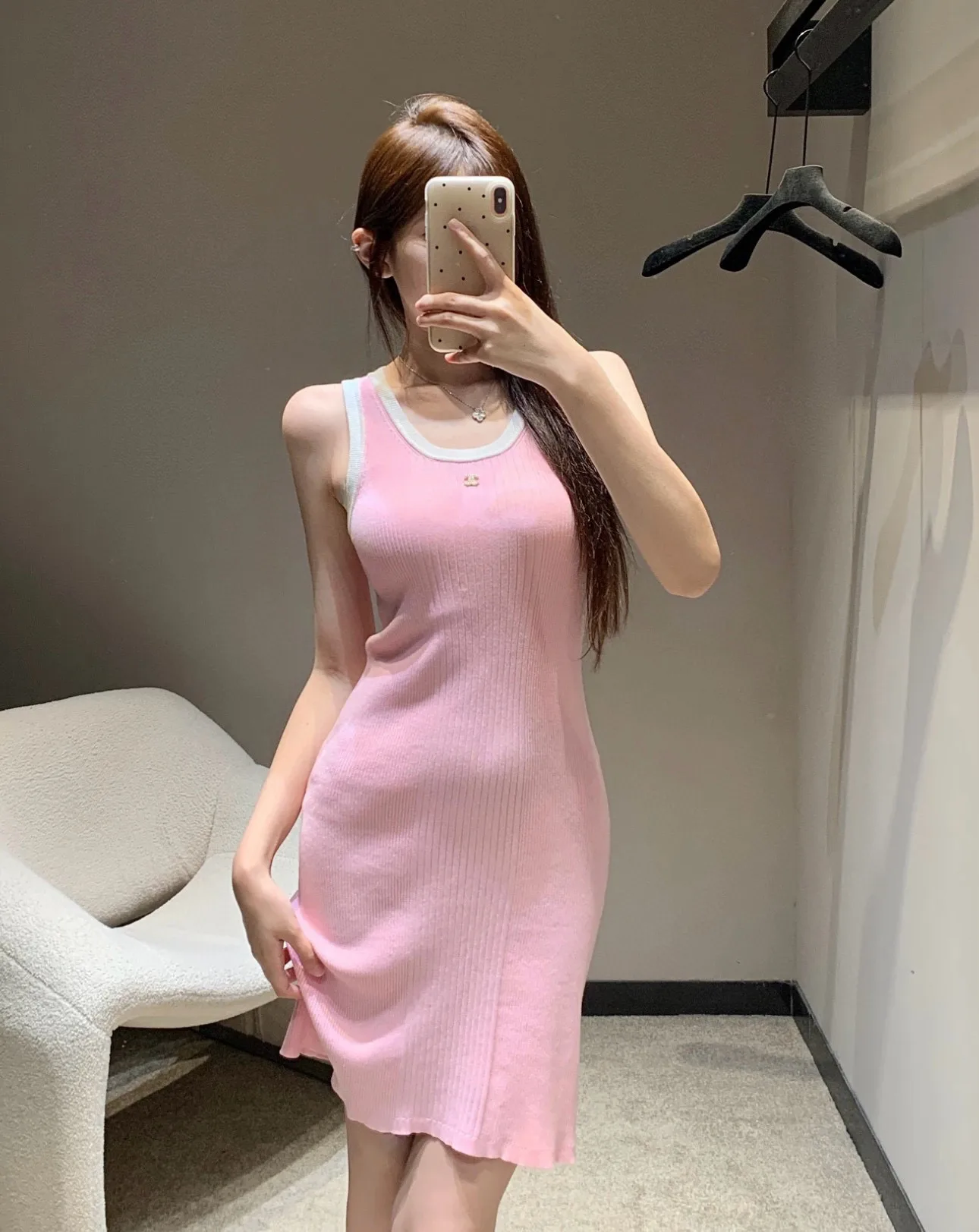 Chanel – Handgenähtes Strick-Westenkleid mit Doppel-C-Diamant-Knöpfen und Kontrast-Muster