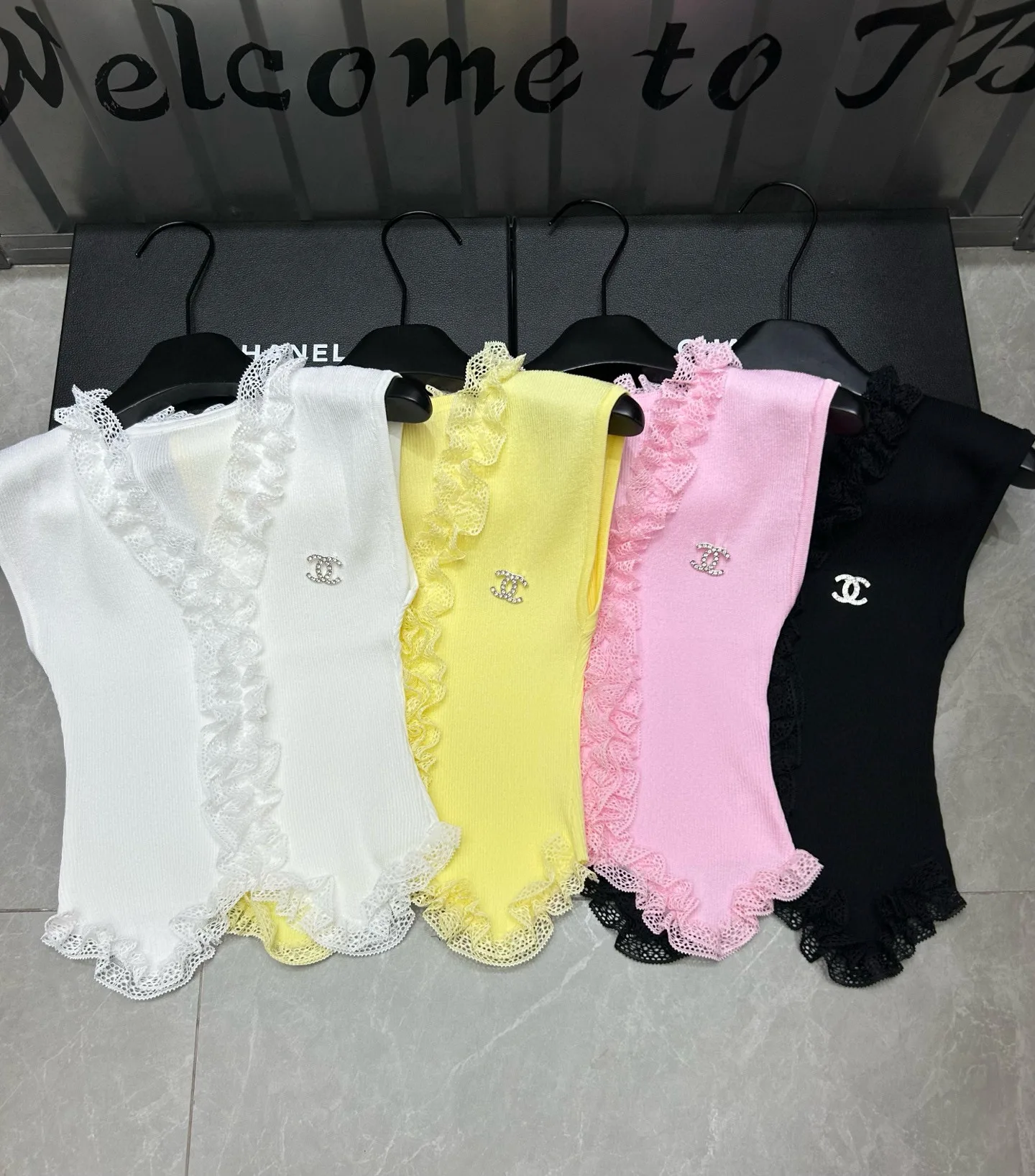 Chanel Strickweste mit V-Ausschnitt und Spitzenbesatz und Brosche