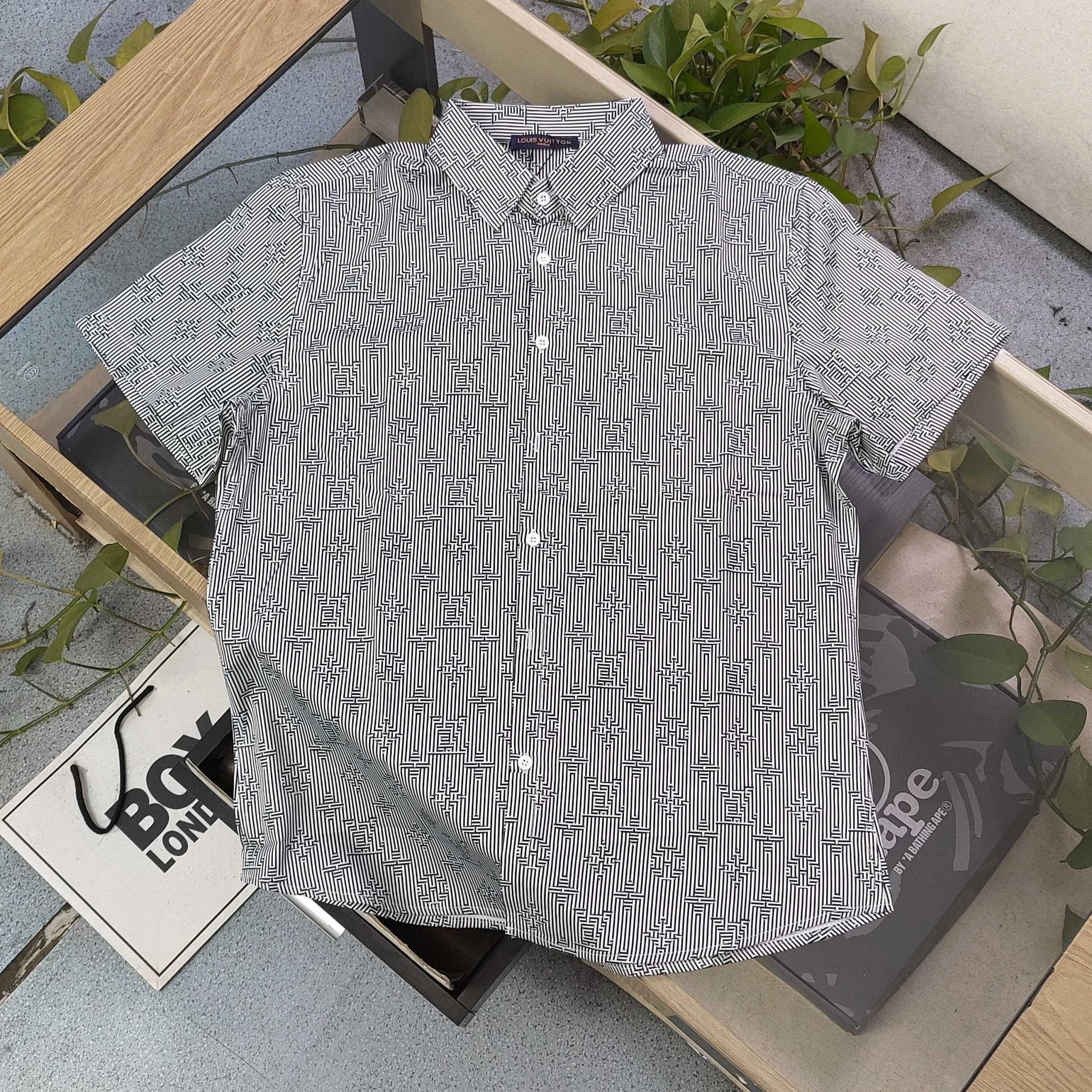 Neues, grau gestreiftes Louis Vuitton LV Kurzarmhemd mit Logo-Print für Paare. Aus glattem Stoff für eine bequeme Passform. Das präzise Karomuster spart Zeit und Material. Der Print sorgt für einen dreidimensionalen Look und einen trendigen und stylischen Look. Perfekt für Ober- und Unterwäsche. Unisex-Style!
