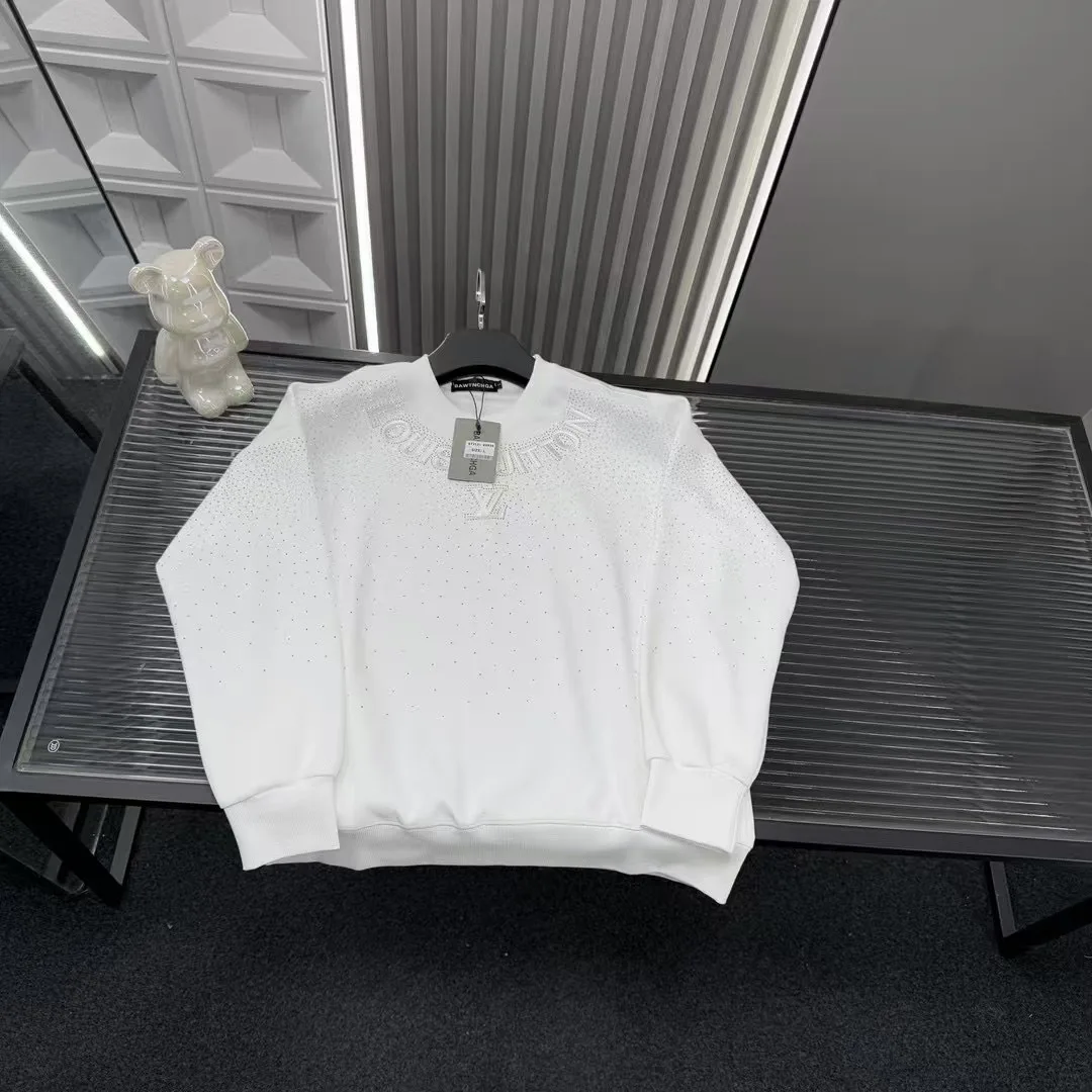 Empfohlen für den Frühherbst: Dieses langärmelige Sweatshirt von Louis Vuitton mit gestickter Buchstabenkette und Strasssteinen sowie Sternenhimmel. Alle drei Etiketten sind im Lieferumfang enthalten und entsprechen der offiziellen Website. Zoomen Sie hinein, um Details zu sehen. Foto mit der Originalkamera aufgenommen.