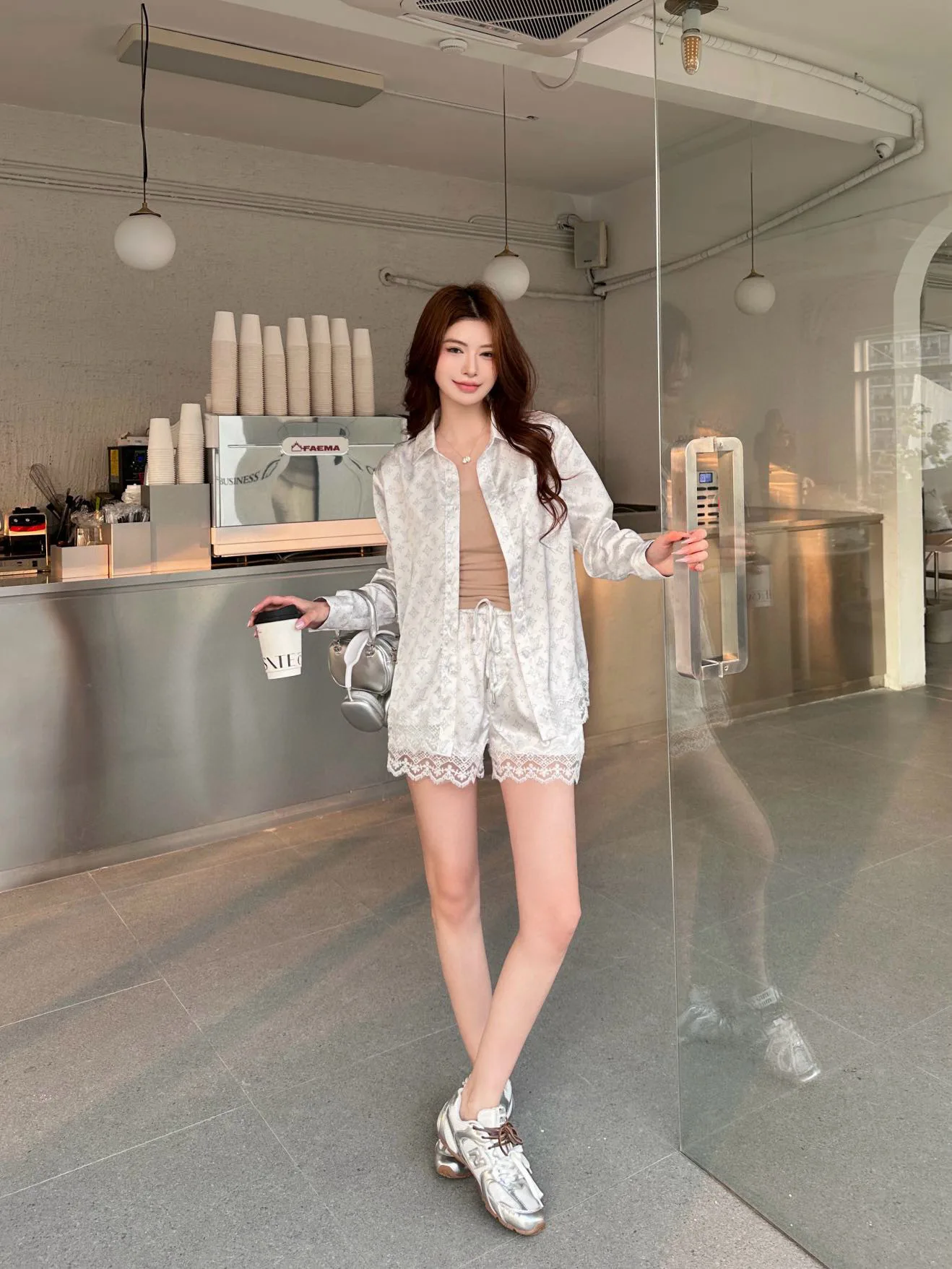 Louis Vuitton LV Set aus Spitzenhemd und Shorts mit durchgehendem, monochromem Kleeblatt-Print