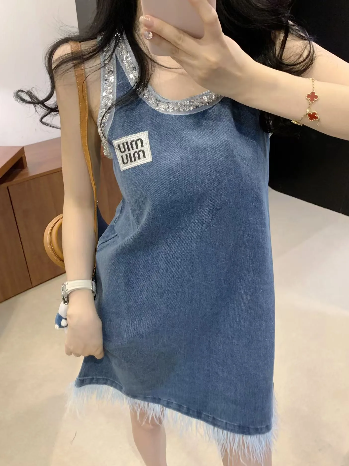 SS Miu Miu neues Jeanswestenkleid –/Mit Pailletten verziert/Federakzente/Lässiger Schnitt, locker und bequem