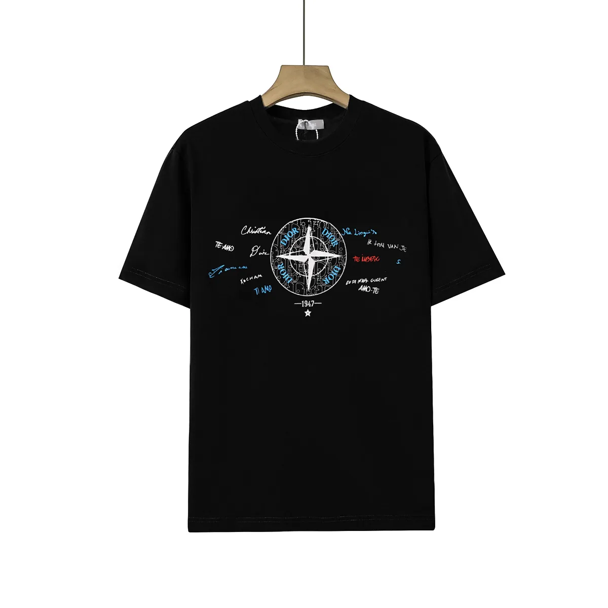 Kurzarm-T-Shirt mit DIOR New Compass Print. Dieses T-Shirt aus 100 % Baumwolle mit importiertem Druck auf Vorder- und Rückseite besteht aus Doppelgarn und hat eine lockere Passform. Es ist mit einem kompletten Besatzset ausgestattet. Der Stoff ist weich, dick und in allen drei Standardgrößen erhältlich. Erhältlich in Unisex-Größen.
