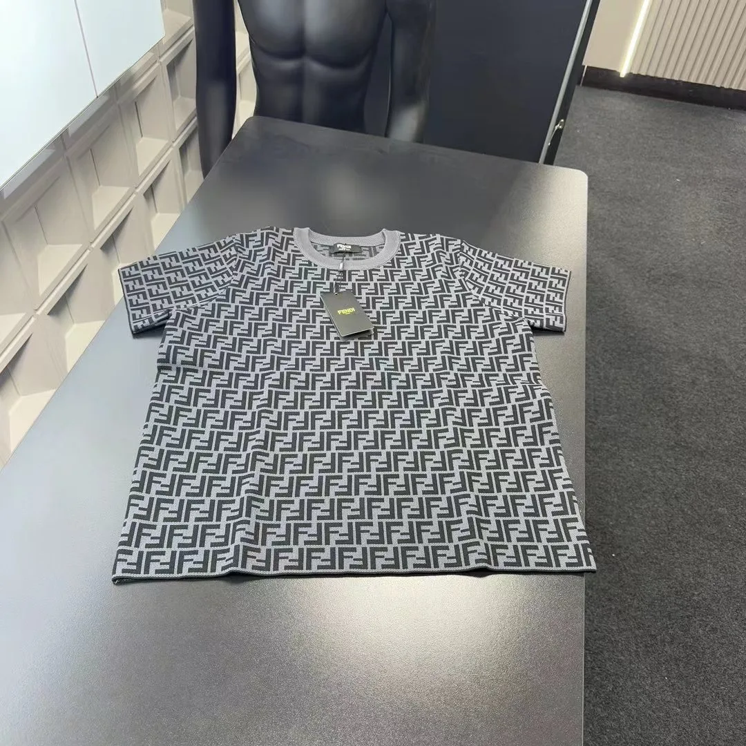 Empfohlene neue Kurzarmshirts: Fendis Allover-FF-Print, einteiliges Strick-Kurzarmshirt. Alle drei Logos sind enthalten, wie auf der offiziellen Website. Zoomen Sie hinein, um Details zu sehen. Foto aufgenommen mit der Originalkamera.