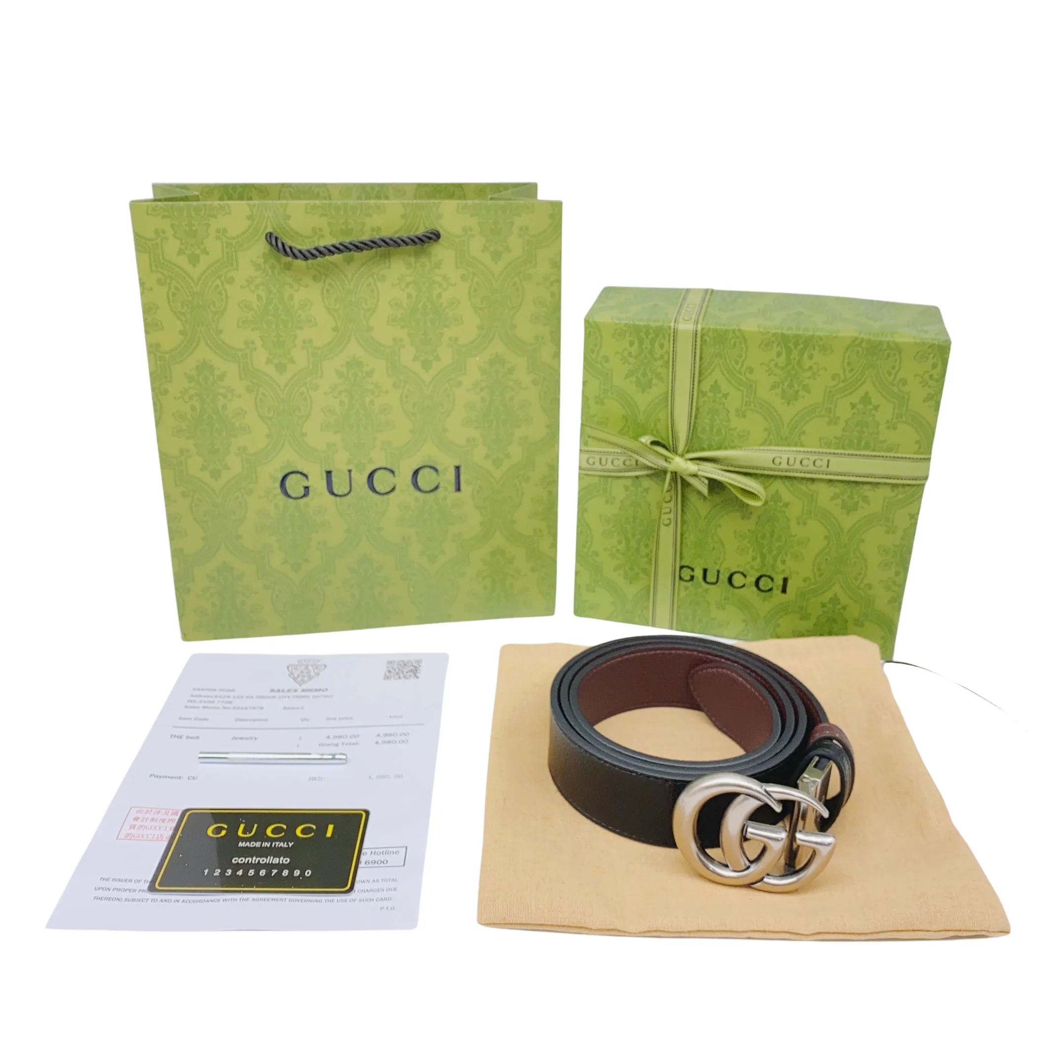 GUCCI Breiter Gürtel mit Doppel-G-Schnalle und silberner Schnalle, schwarz-braunes Leder, Breite 0,5 cm. Wendegürtel mit Doppel-G-Schnalle – Modell CAON – Preis auf der offiziellen Website