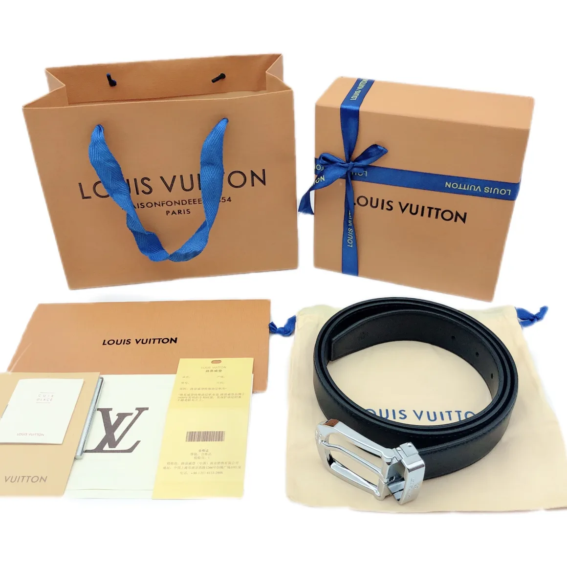 Louis Vuitton Neuf Herrengürtel aus Rindsleder, Schwarz, breit, 0,6 cm, Basis aus genarbtem Rindsleder und hochwertiges Futter! Dieser Gürtel aus importiertem genarbtem Rindsleder ist unglaublich widerstandsfähig und bequem und unterstreicht die hochwertigen Materialien und die Qualität des Gürtels. Das hochwertige, verformungshemmende Futter erhöht die Gesamtbelastbarkeit des Gürtels und verhindert Verformungen des Gürtels und seiner Löcher. Der mit aufwendigen Nähten gefertigte Gürtel verfügt über einen einteiligen, umgeschlagenen Saum für eine verschleißfestere Kante, die Rissen bei Hitze und Kälte vorbeugt. Importiertes, fein genähtes Leder sorgt für Robustheit und Stärke. Der einfarbige Faden sorgt für einen sachlichen, dezenten und stilvollen Look. Stilvolle Dornschließe aus Edelstahl! Diese Dornschließe aus Edelstahl ist deutlich robuster und langlebiger als Schnallen aus Kupfer oder Gold, und ihre sorgfältige Verarbeitung verleiht einen Hauch von Luxus. Die Schließe ist sicher mit dem Gürtel verbunden und ermöglicht so eine einfache Längenverstellung. Die individuellen Logos sind nahezu identisch und gewährleisten so hohe Qualität – ein perfektes Geschenk.