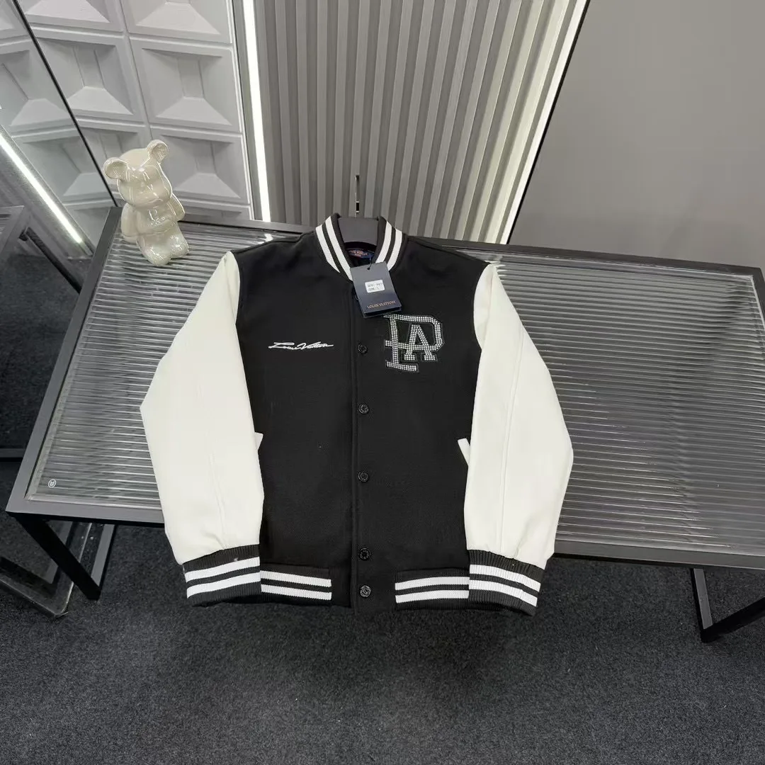Empfohlene Oberbekleidung für den Frühherbst: Diese Louis Vuitton Baseballjacke hat einen perlenbesetzten, strassbesetzten Stehkragen. Alle drei Etiketten sind identisch mit denen auf der offiziellen Website. Zoomen Sie hinein, um Details zu sehen. Foto mit der Originalkamera aufgenommen.