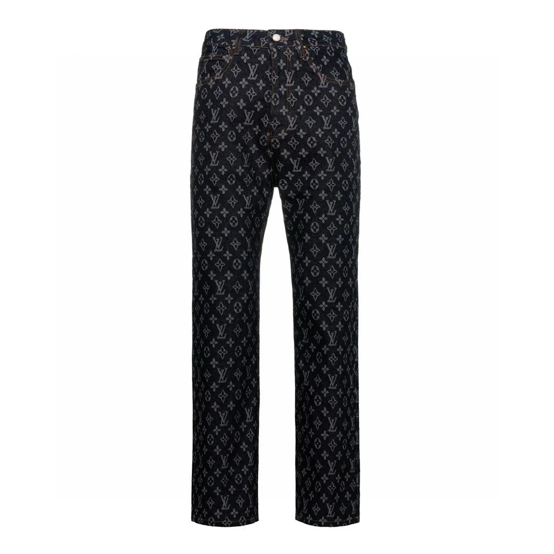 Jeans mit Allover-Print von LOUIS VUITTON. Hochwertiger, individueller Stoff: Detailreicher, dreidimensionaler Schriftzug, maßgeschneidertes Futter, Schnalle aus Kalbsleder, exklusive Perlmuttknöpfe aus Metall, Laserschriftzug und ein authentisches, importiertes Tajima-Stickmuster. Die intensive Handwäsche sorgt für ein zartes, atmungsaktives und angenehmes Tragegefühl, vergleichbar mit handelsüblichen ZP-Jeans. Perfekt für Damen und Herren. Der ultimative Unisex-Style!