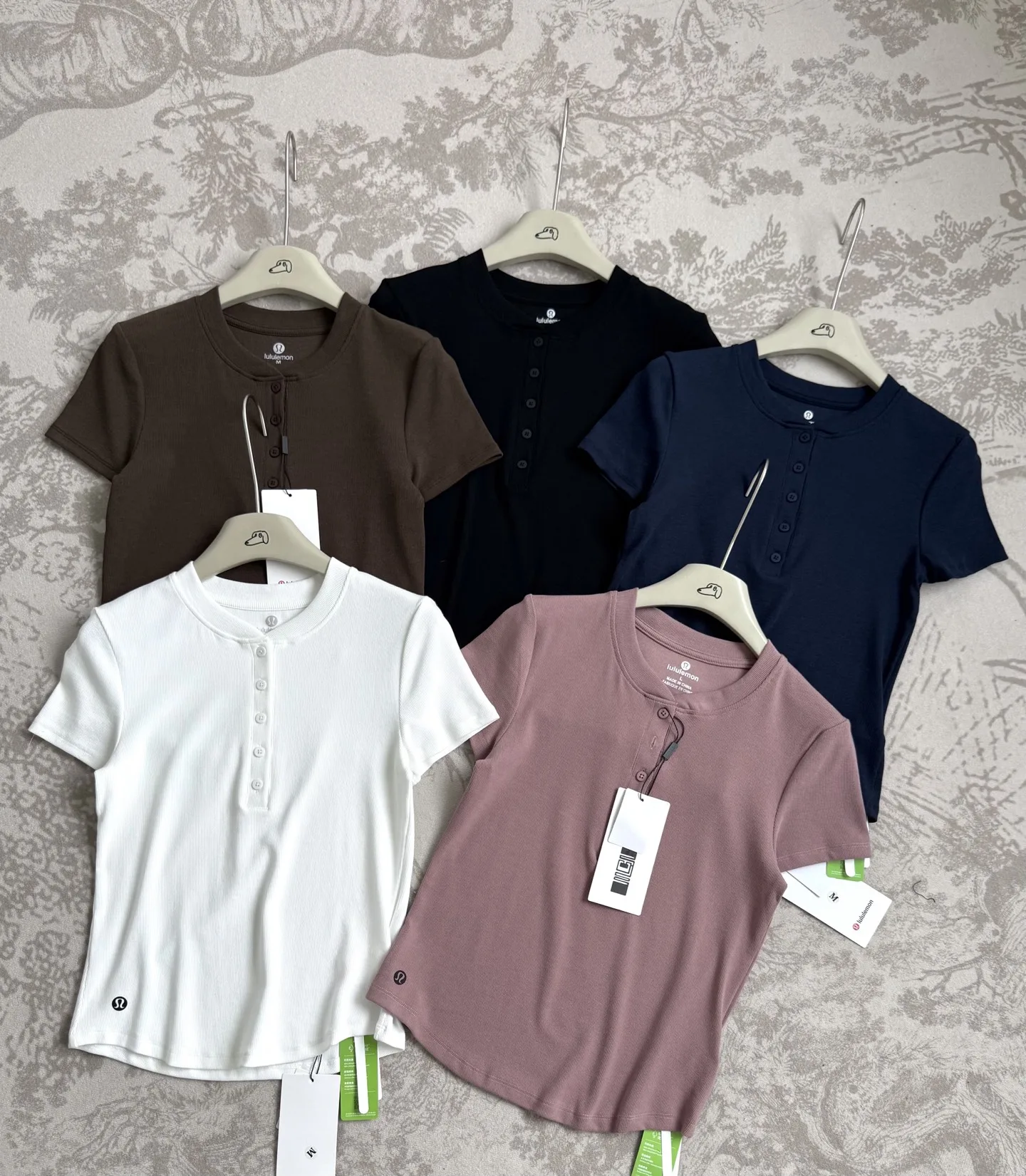 Exklusiv! Lululemons neue Frühjahr/Sommer-Kollektion! Damen-Kurzarmshirt Cloud Henley Knit! Hervorragender Zustand! Sehr empfehlenswert vom Verkäufer! Online und im Geschäft erhältlich! Aus maßgefertigtem Stoff! % Baumwolle + , % Viskose + , % Elastan! Das perfekte Verhältnis! Allgemein bekannt als Ukos! Unglaublich schlank machend und schmeichelhaft! Weich, bequem und dehnbar! Sichtbar detaillierte Textur! Umweltfreundlich und gesund! Sehr saugfähig! Langlebig! Behält seine Form auch nach wiederholtem Tragen und Waschen! Gerade Schultern, taillierte Taille und abgerundeter Saum! Schlank machend und schmeichelhaft! Sieht oben toll aus! Elegant und edel! Einfach fantastisch! Nicht verpassen! Nicht verpassen! Farben: Schwarz, Weiß, Dunkelrosa, Braun, Marineblau