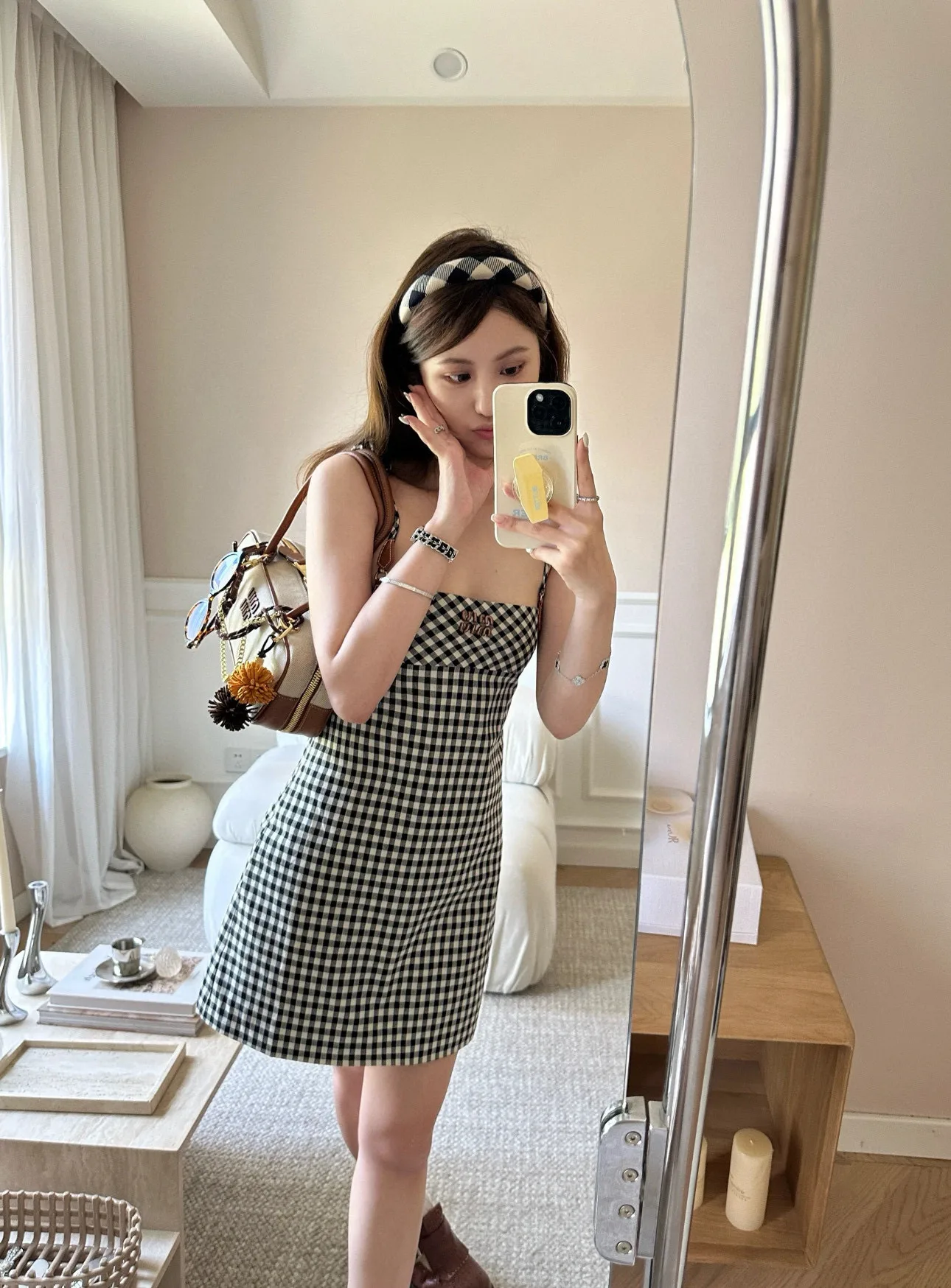 Miumiu Miu Miu Kariertes Kleid mit bestickten Lederträgern