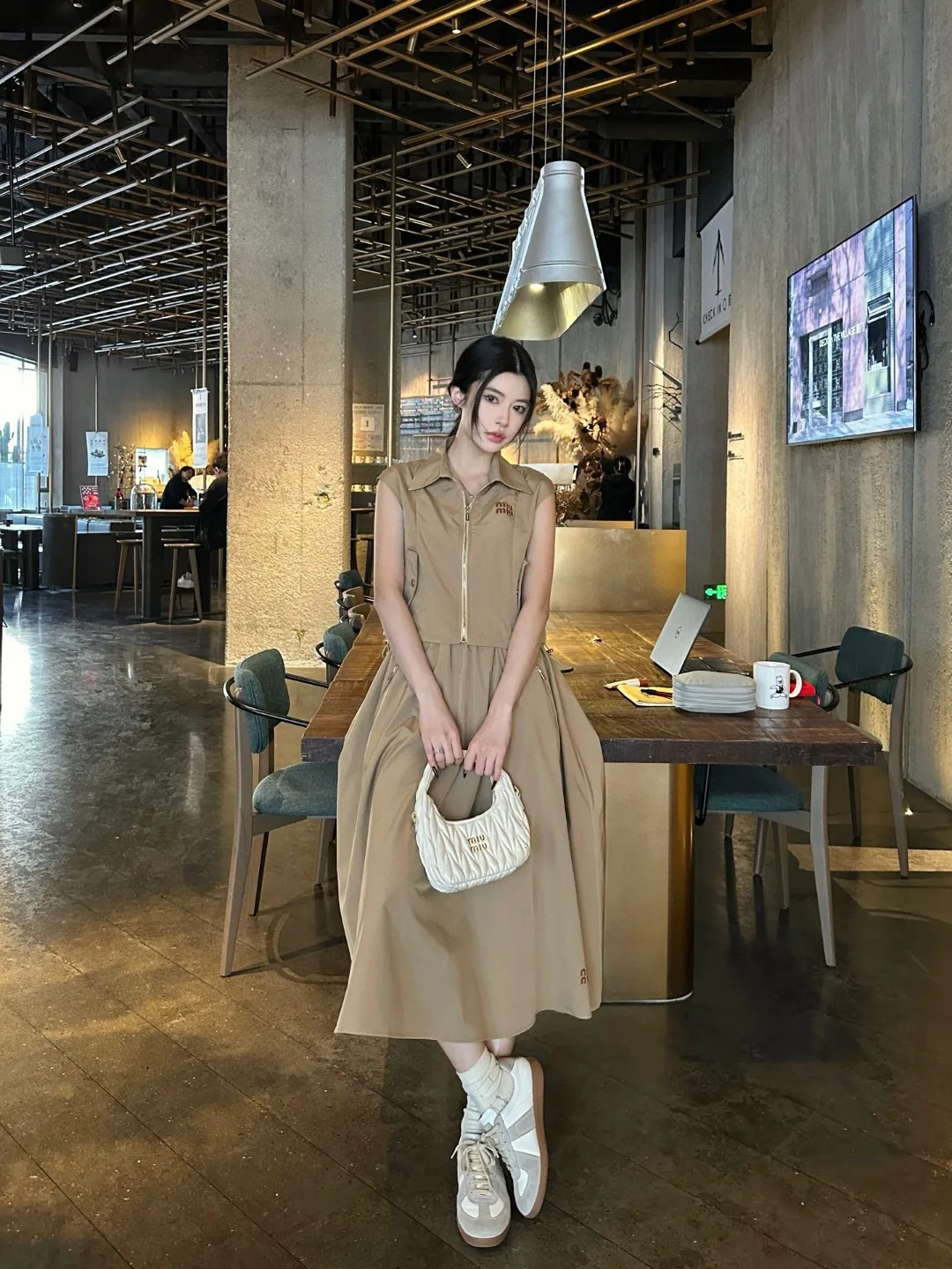 Neu erschienen: Miu Miu SS Neues Set. Weste, Oberteil und Rock mit Revers und monogrammiertem „S“ für einen eleganten Look.