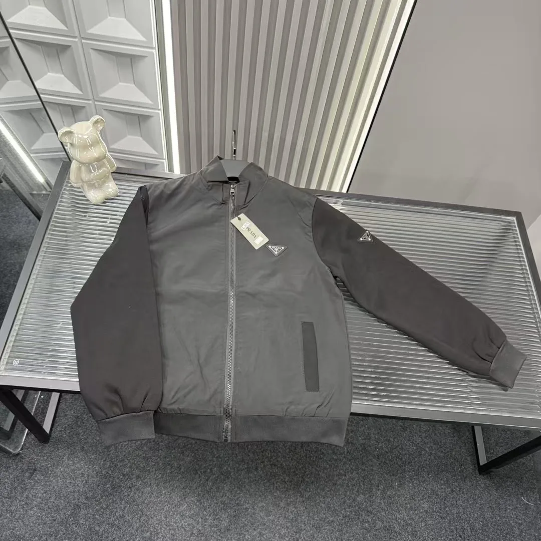 Empfohlene Oberbekleidung für den Frühherbst: Pradas Patchwork-Ärmel, das dreieckige Abzeichen und der Stehkragen. Alle drei Logos sind identisch mit denen auf der offiziellen Website. Zoomen Sie hinein, um Details zu sehen. Foto mit der Originalkamera aufgenommen.