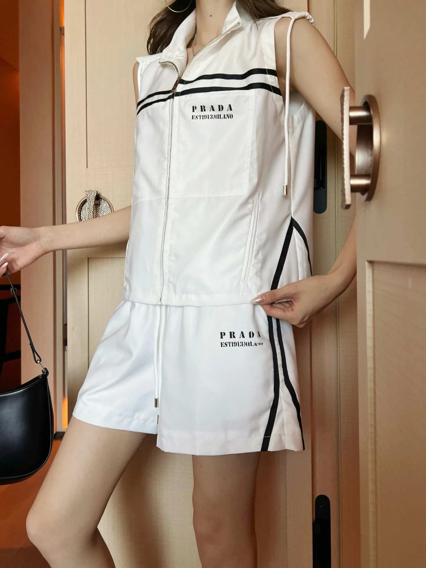 Prada-Monogramm-Print, kontrastierendes Gurtband, Kapuzenweste mit Reißverschluss, Kordelzug und Shorts mit elastischem Bund