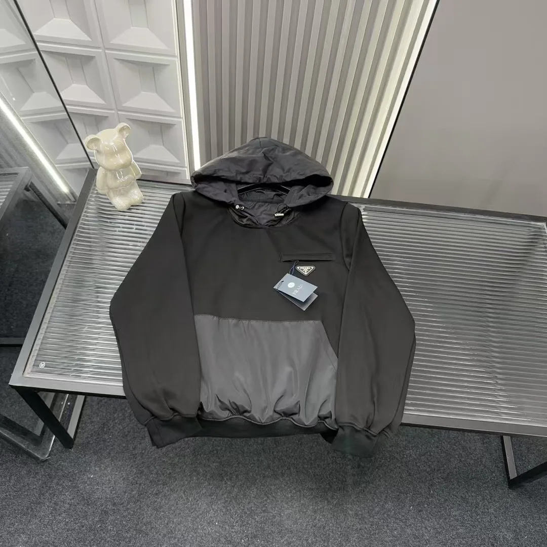 Empfohlene Sweatshirts für den Frühherbst: Pradas Kapuzensweatshirt mit Dreieck-Prägung. Alle drei Logos sind identisch mit denen auf der offiziellen Website. Zoomen Sie hinein, um Details zu sehen. Foto mit der Originalkamera aufgenommen.