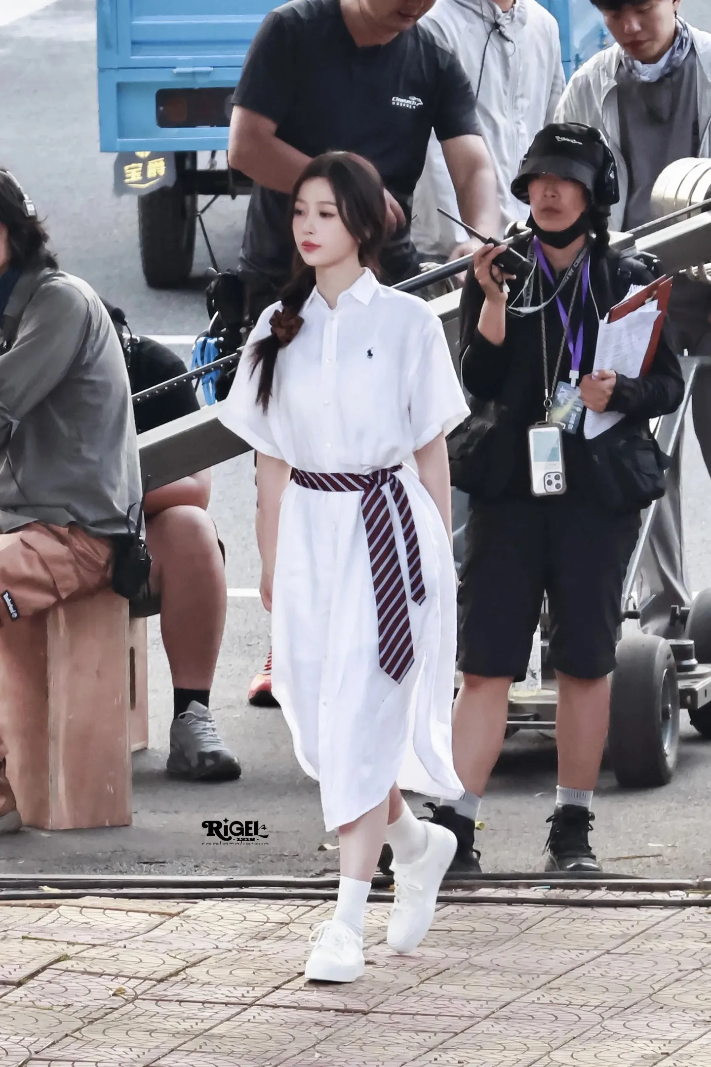 Yu Shu trägt ein schlichtes weißes Hemdblusenkleid. Die lässig hochgekrempelten Ärmelbündchen strahlen einen entspannten Look aus. Die gestreifte Krawatte betont die Taille und rahmt ihre schlanke Figur gekonnt ein.
