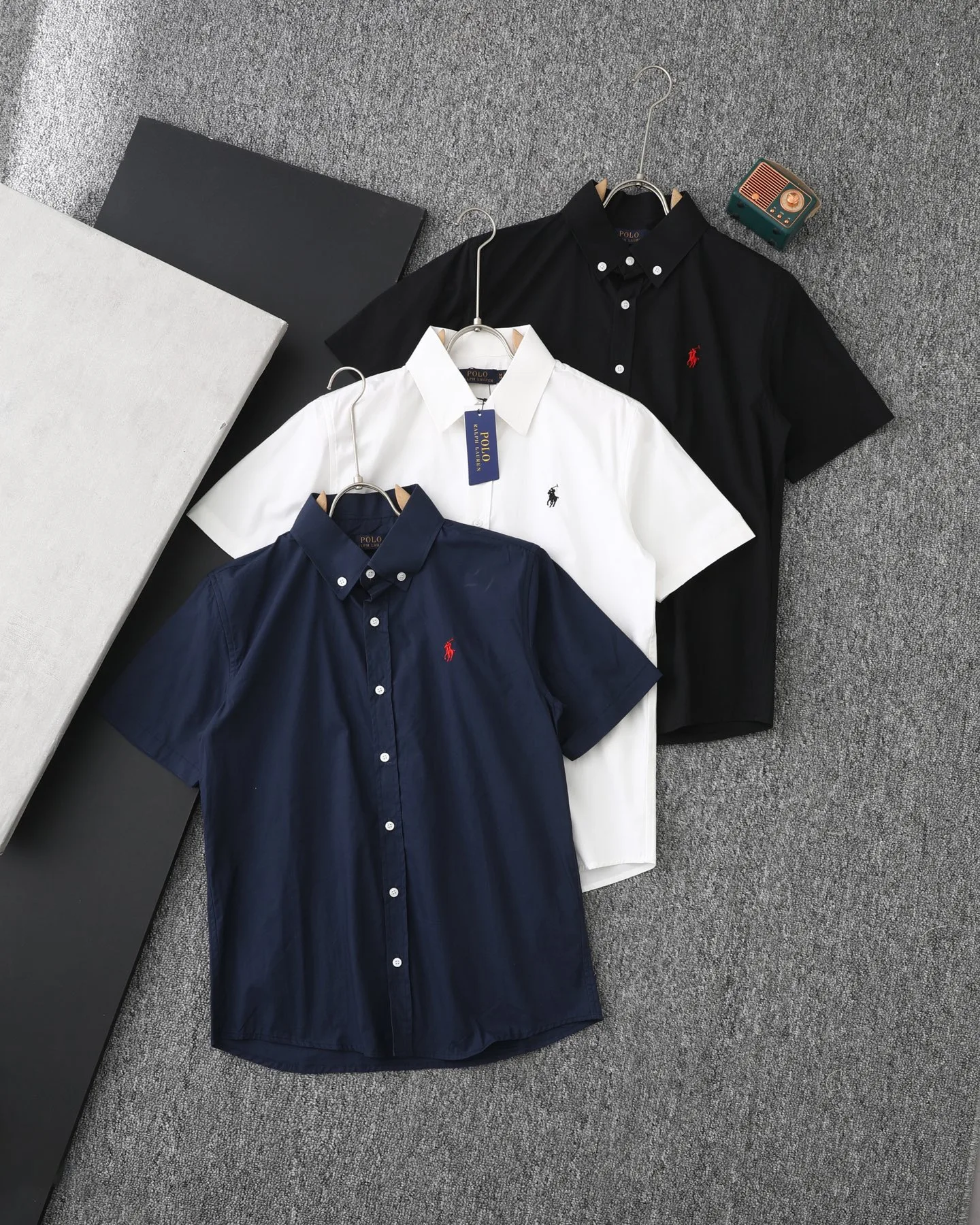 Klassisches Unisex-Kurzarmhemd von Luren/Ralph Lauren mit einfarbiger Stickerei. Sommerliches Kurzarmhemd aus reiner Baumwolle.