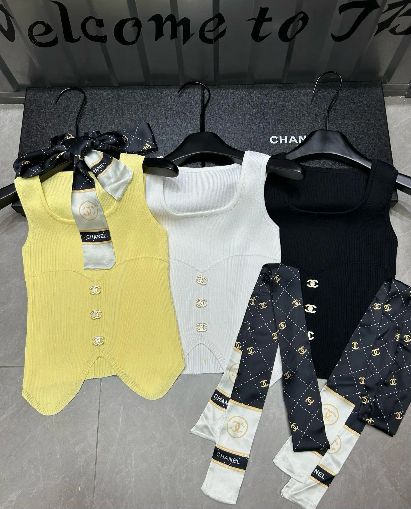 Chanel Custom Doppel-C-Strickweste mit unregelmäßigem Muster und Seidenschal