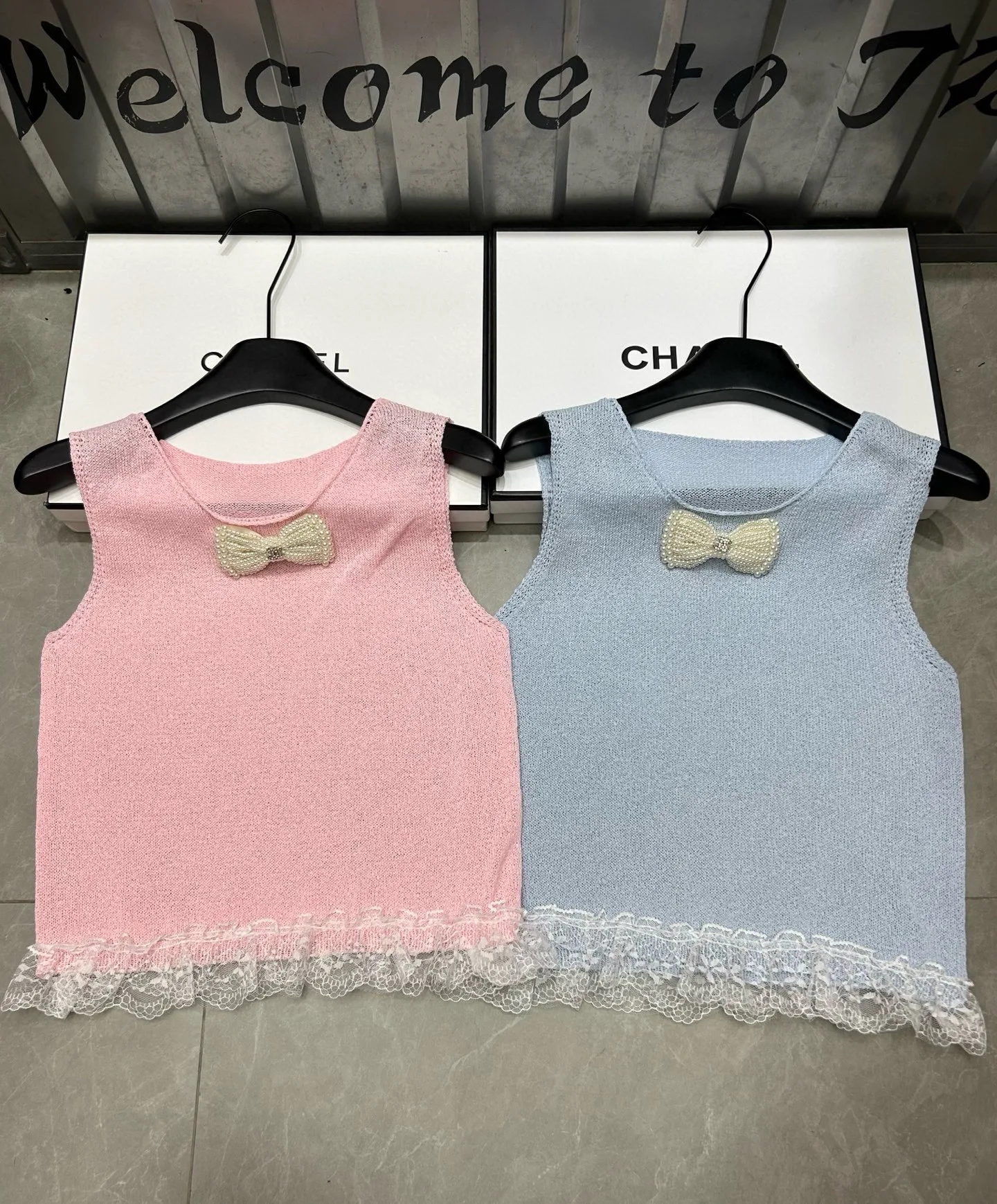 Chanel Double C Strickweste mit Perlenschleife und Spitzenbesatz