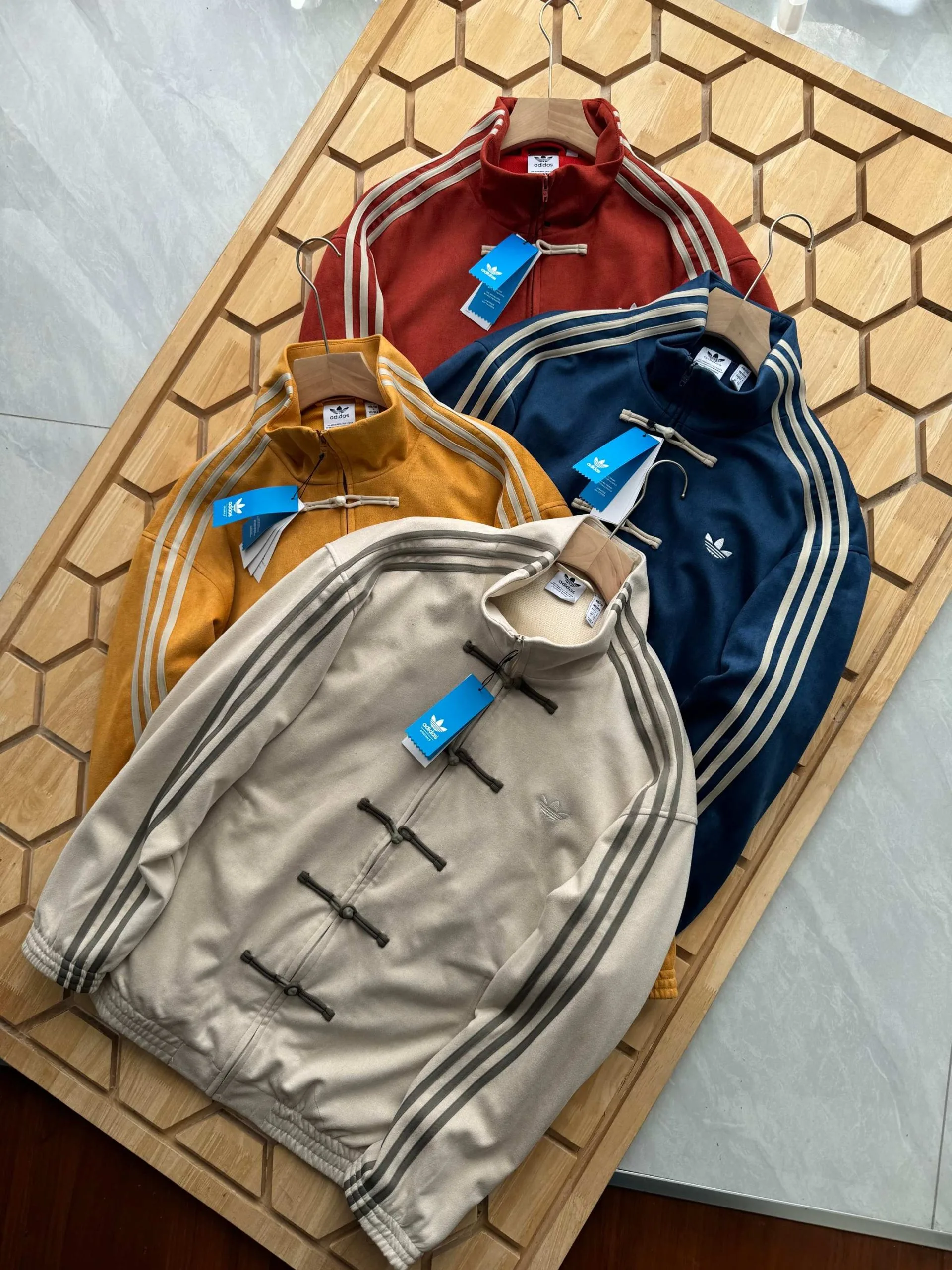 Exklusiv zum Jahr der Schlange: Der neue chinesische Stil für das neue Jahr! Adidas Trefoil Neue chinesische Hanfu-Tang-Anzugjacke aus Wildleder im Paar-Stil, Wang Anyus passender Stil – adidas Originals CTT Year of the Snake Limited Edition. Stilvolle, bequeme, vielseitige, locker sitzende, langärmelige Jacke im amerikanischen Retro-Stil für Damen und Herren.