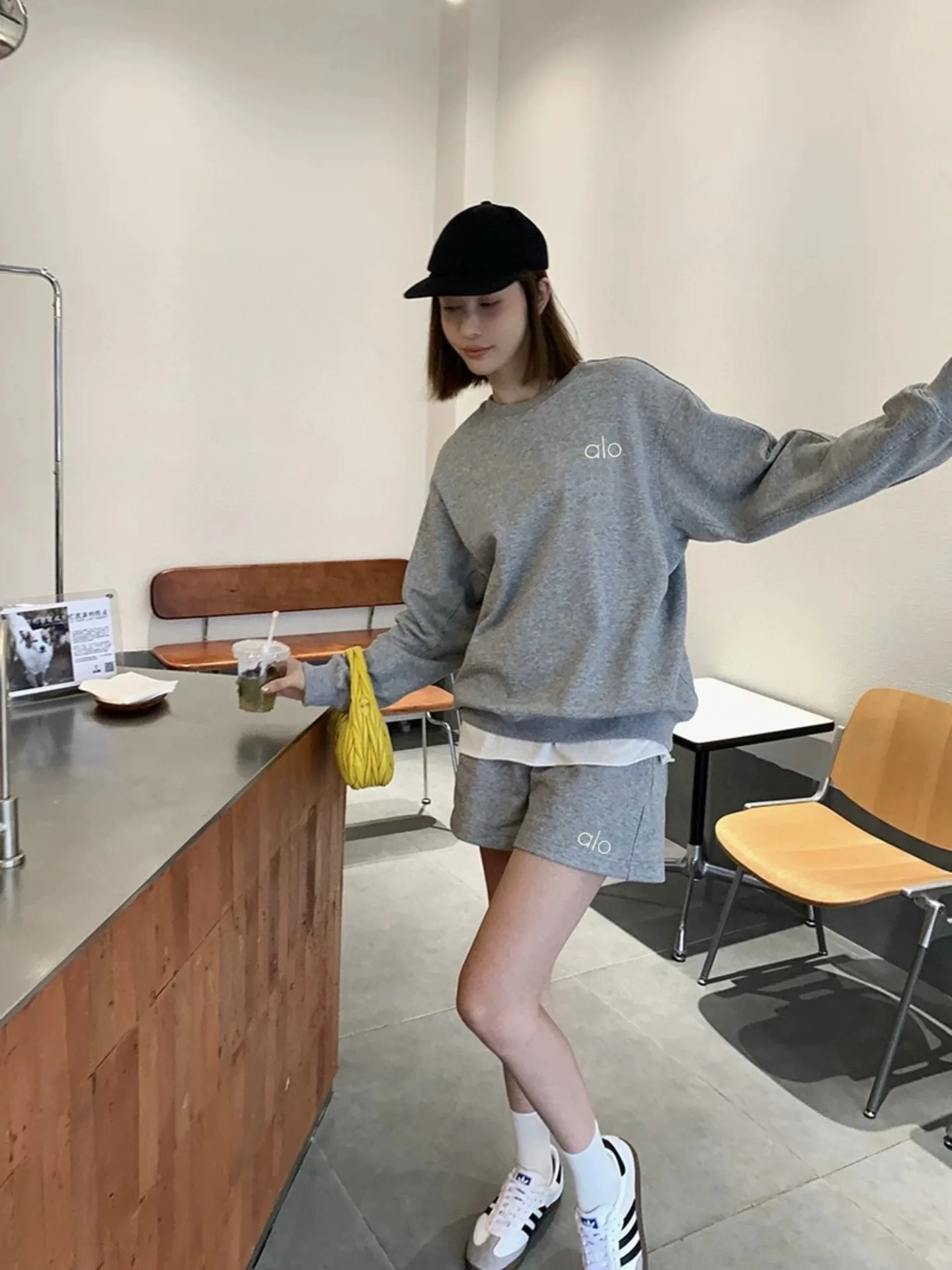 Alo Kendall Jenner-inspiriertes Rundhals-Sweatshirt und Shorts mit elastischem Bund
