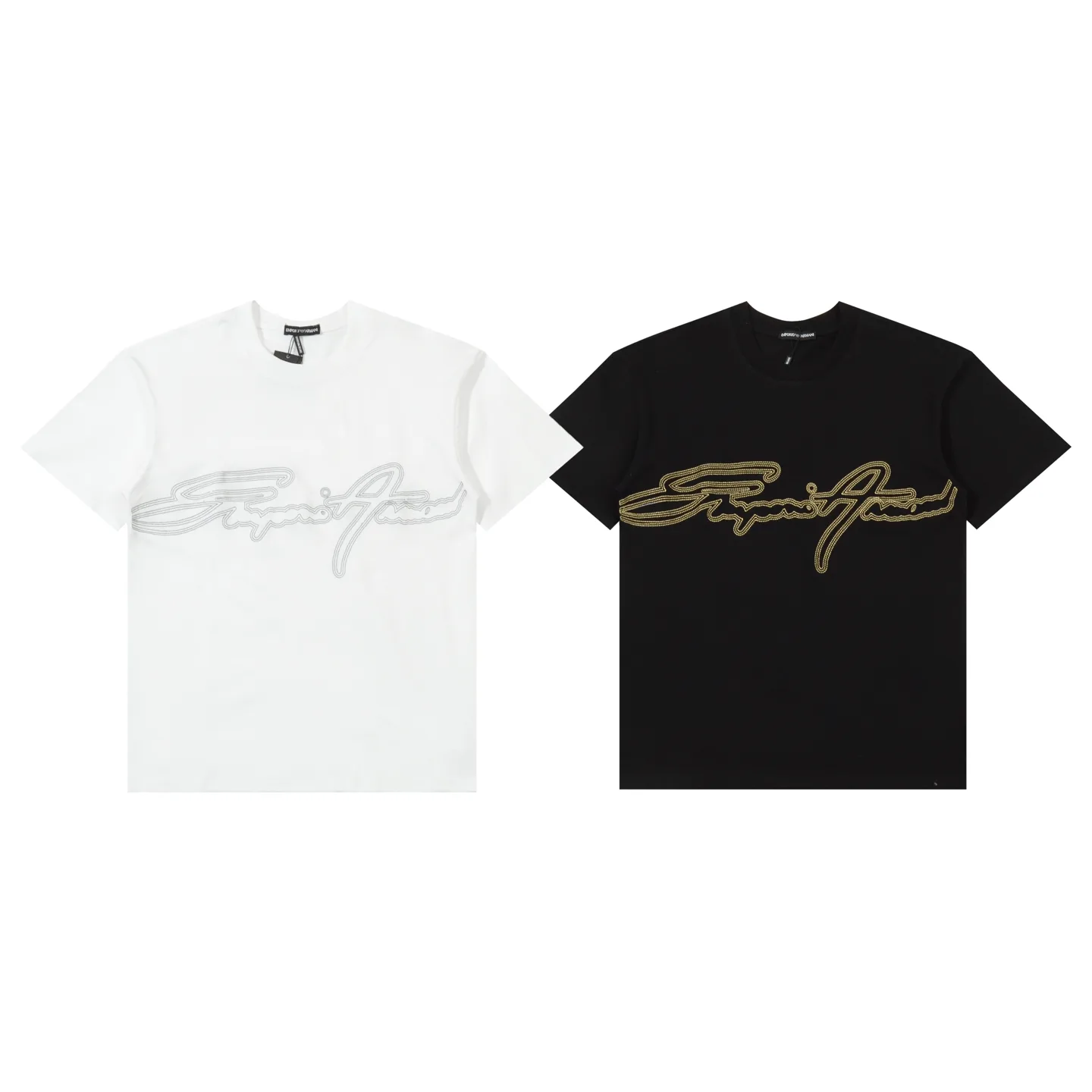 Kurzärmeliges Hemd mit Rundhalsausschnitt und Armani-Signaturstickerei. Stil identisch mit der offiziellen EMPOARMANI-Website. Stoff: Doppelt gesponnene Baumwolle. Gleiche Farbe, im gleichen Bottich gewebt und gefärbt. Verarbeitung: Importierte Maschinen für satte, hochwertige Stickerei mit 10.000 Stichen. Das eingefädelte Design behält auch nach wiederholtem Waschen seine Form. Pillingfrei, farbecht, bequem und atmungsaktiv. Hochtemperatur-Vorschrumpfbehandlung. Komplett mit drei Etiketten. Professionell auf das Muster abgestimmte importierte Maschinen. Maßgeschneiderte Passform. Maximales Tragegewicht: 100 Catties. Die Größen werden manuell gemessen, daher sind Abweichungen von 1 cm normal. Farben: Schwarz, Weiß. Größen: M, L, XL.