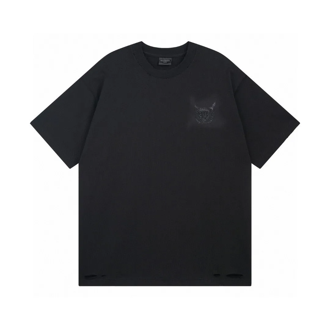 Balenciaga SS: Gestickte Weizenähren auf der Vorderseite, handgemaltes Graffiti auf der Rückseite, Kurzarm-T-Shirt im Used-Look.