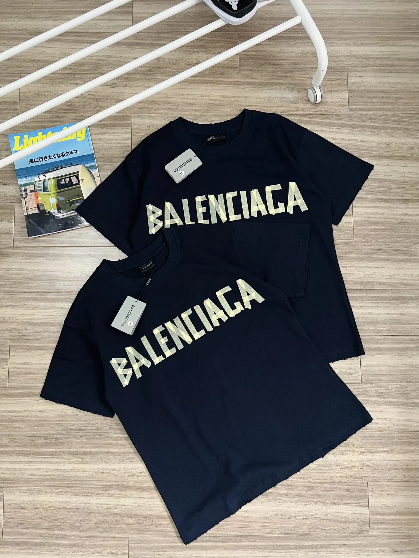Balenciaga Yellow Tape Retro Slogan Washed and Distressed Kurzarm-T-Shirt (Original Navy)