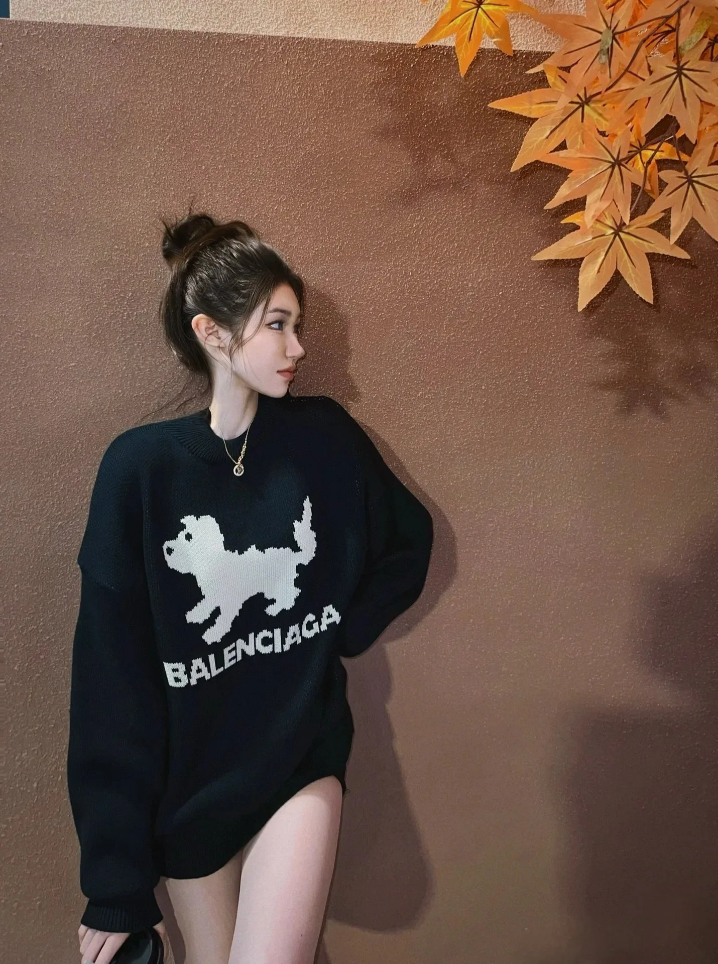 Wir präsentieren eine Balenciaga-Kollaboration mit einem Rundhalspullover mit Welpen-Print, klassischem Jacquard-Monogramm-Muster und einem locker gestrickten Pullover für Herbst und Winter.