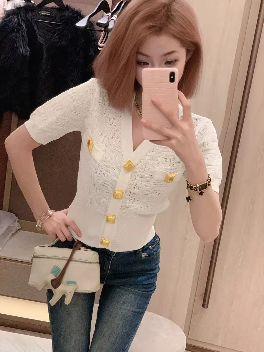 Balmain-Monogramm-Jacquard mit goldenen Knöpfen und kurzen Strickärmeln mit V-Ausschnitt