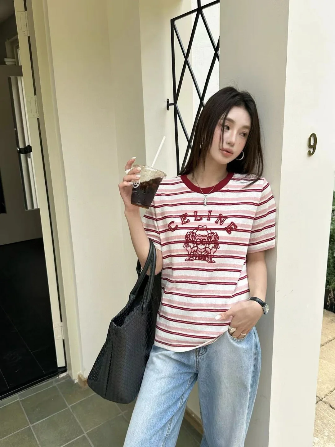 Celine Arc de Triomphe-Logo-Stickerei, gestreiftes Kurzarm-T-Shirt mit Rundhalsausschnitt