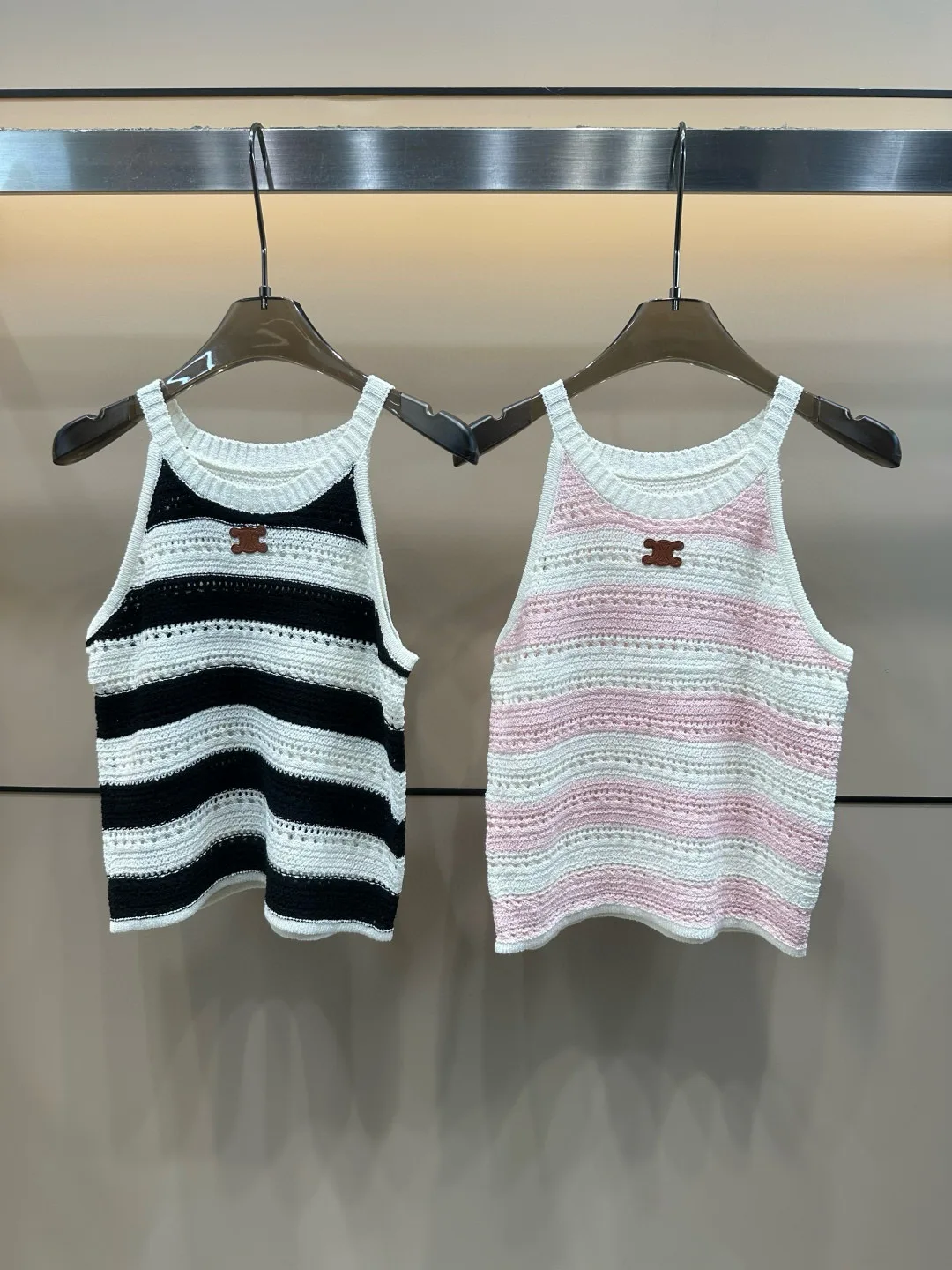 Celine Arc de Triomphe Leder-Strickweste mit Logo und Streifen in Colorblock-Optik