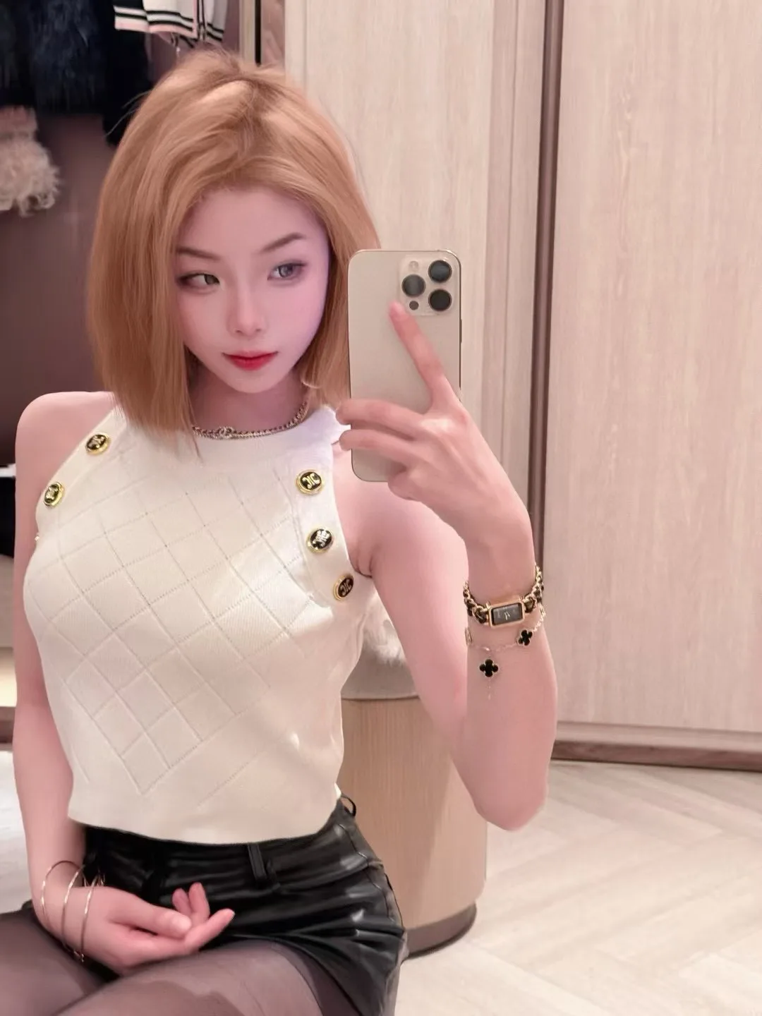 Celine Custom Arc de Triomphe Strickweste mit Knopfdesign und Diamantquarz-Verzierung und Hohlkragen