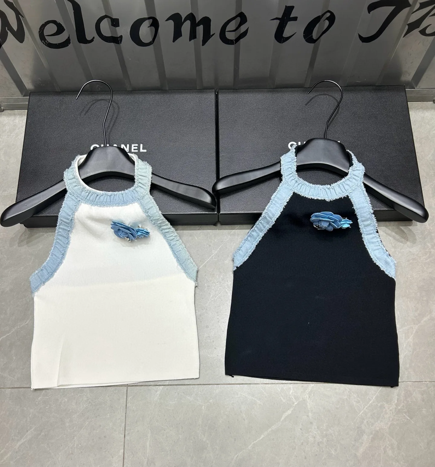 Chanel Denim Neckholder-Strickweste mit Brosche
