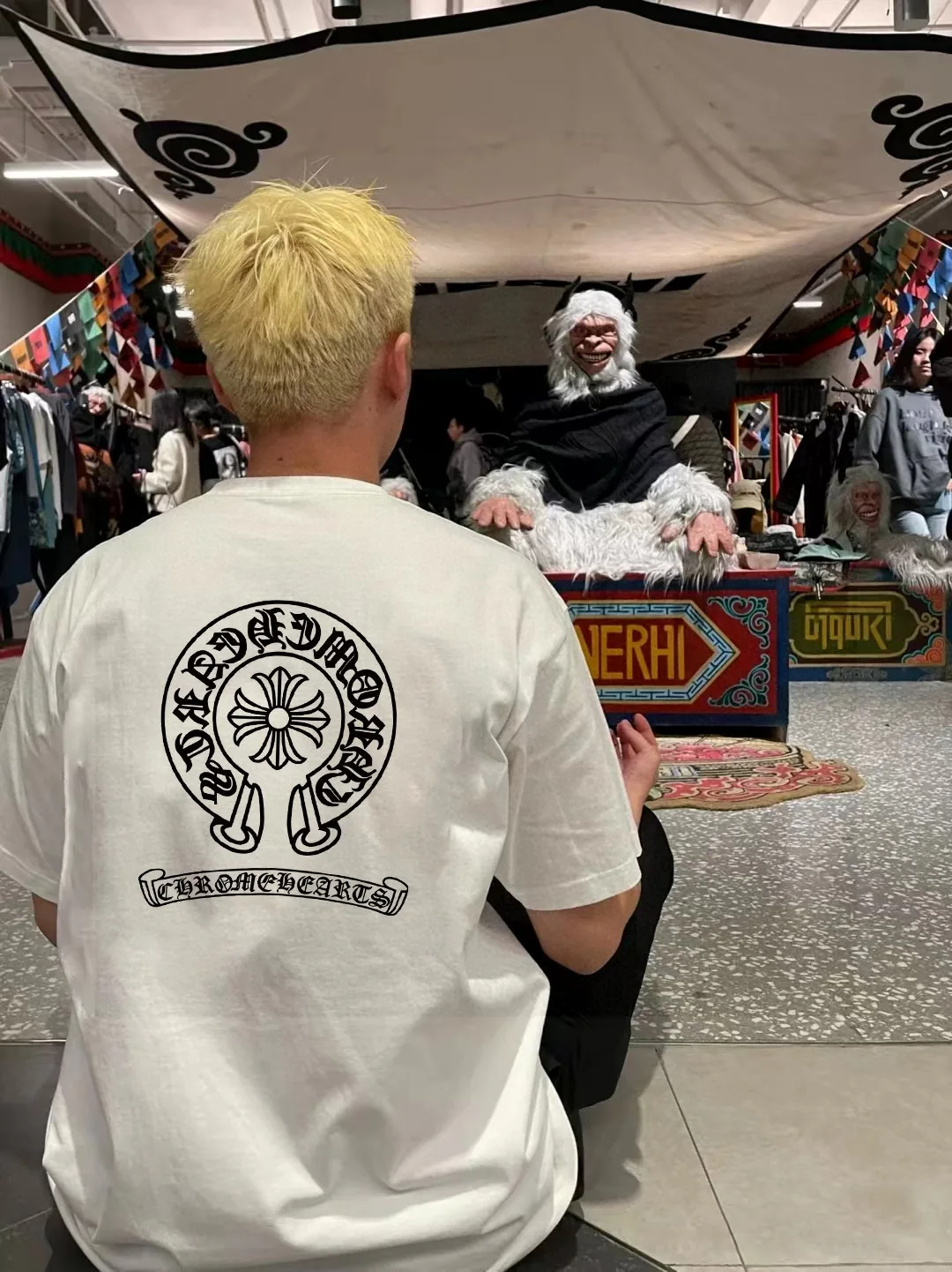 Hochwertig. Dieser Chrome Hearts CH-Konter präsentiert sich mit einem Hufeisenblumen- und Kreuzschrift-Print und einem passenden Kurzarmhemd. Er besteht aus speziell gekämmter Baumwolle und der Halsausschnitt ist mit einem speziell gewebten Fadenmuster versehen, um Verformungen vorzubeugen. Der Kragen ist mit drei Nadeln und fünf Fäden genäht, der Halsausschnitt ist konisch zulaufend und mit einem Schulterfutter versehen. Die Verarbeitung und die Stoffdetails sind makellos. Der Druck ist mit importierter Schlichte gefertigt, und die hochwertige Stickerei ist exquisit und detailreich. Einfach perfekt!