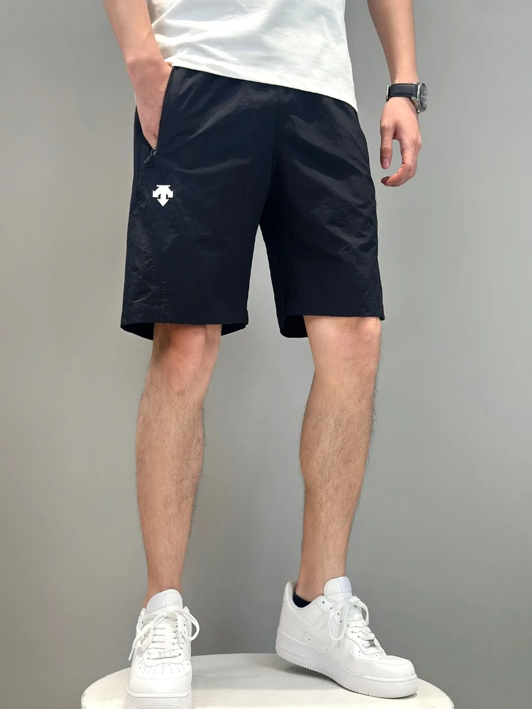 Verfügbar: Die einfarbigen, lässigen Shorts von Descente sorgen für einen längeren Beinschnitt und eine lockere Passform für optimale Bewegungsfreiheit. Sie sind in vier Farben erhältlich und verfügen über einen elastischen Bund mit verstellbarer Schnalle. Vier Taschen pro Paar sorgen für praktische Aufbewahrung! Zwei Reißverschlusstaschen auf jeder Seite mit speziellen Harzreißverschlüssen sorgen für ein geschmeidiges, müheloses Tragegefühl. Zwei Pattentaschen auf der Rückseite.