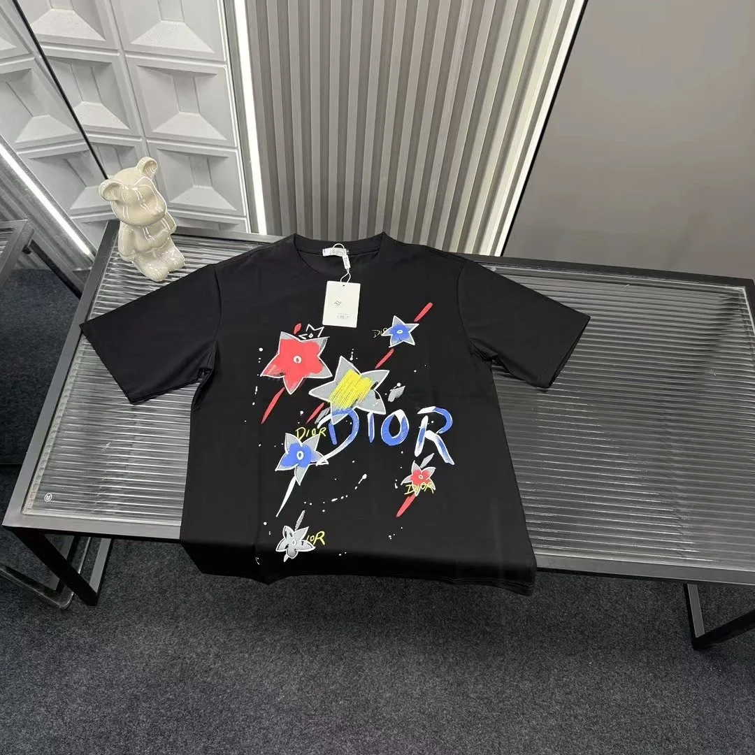 Empfohlenes Kurzarmshirt: Diors farbenfroher Schriftzug mit Sternen und Spritztinte. Alle drei Logos sind identisch mit denen auf der offiziellen Website. Zoomen Sie hinein, um Details zu sehen. Foto mit der Originalkamera aufgenommen.