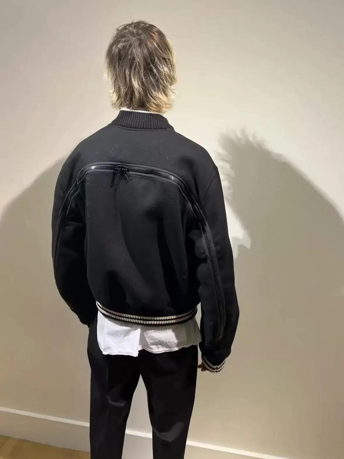 Dieses Kleidungsstück ist wirklich vielseitig. Es lässt sich im Streetstyle wie eine traditionelle Bomberjacke tragen oder elegant mit Hemd oder Hose kombinieren. (Ich finde die Farbkombination der DVN-Bündchen und des Saumripps sehr bequem und elegant.)