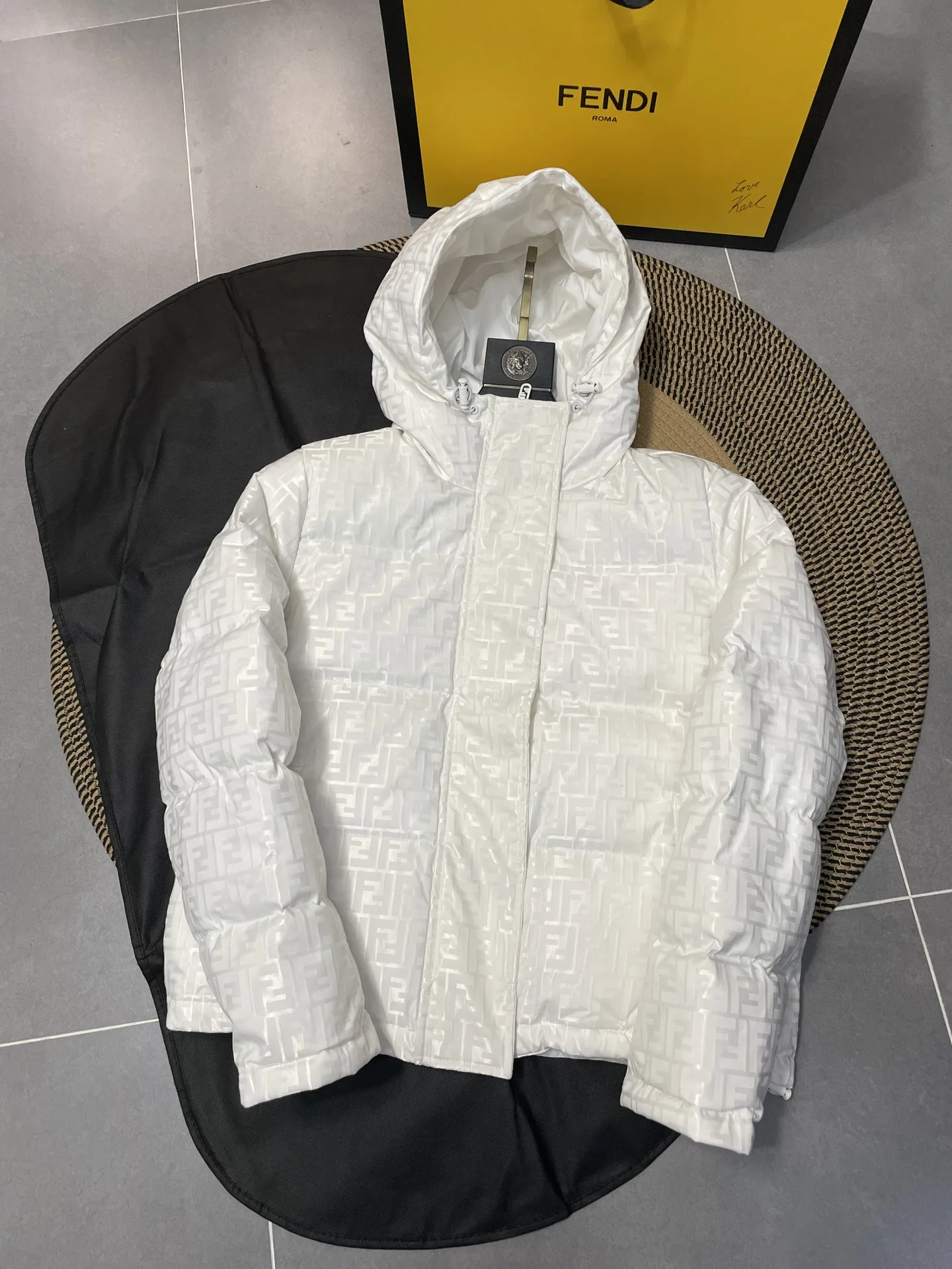 FENDIs Daunenjacke mit Kapuze und Monogramm-Muster besticht durch ein dezentes Jacquard-Strickmuster mit Doppel-F. Dieses Modell verkörpert höchste Handwerkskunst und Design. Gefüttert mit chinesischem Fleece, spiegelt das unverwechselbare Jacquard-Muster mit Doppel-F sofort Ihren Stil und Geschmack wider. Ein verdeckter Reißverschluss sorgt für Wärme, und die Innenseite ist mit warmem chinesischem Fleece gefüllt, was die Jacke leicht, warm und unglaublich bequem macht. Dieser Retro-High-Street-Style ist ein Must-have.