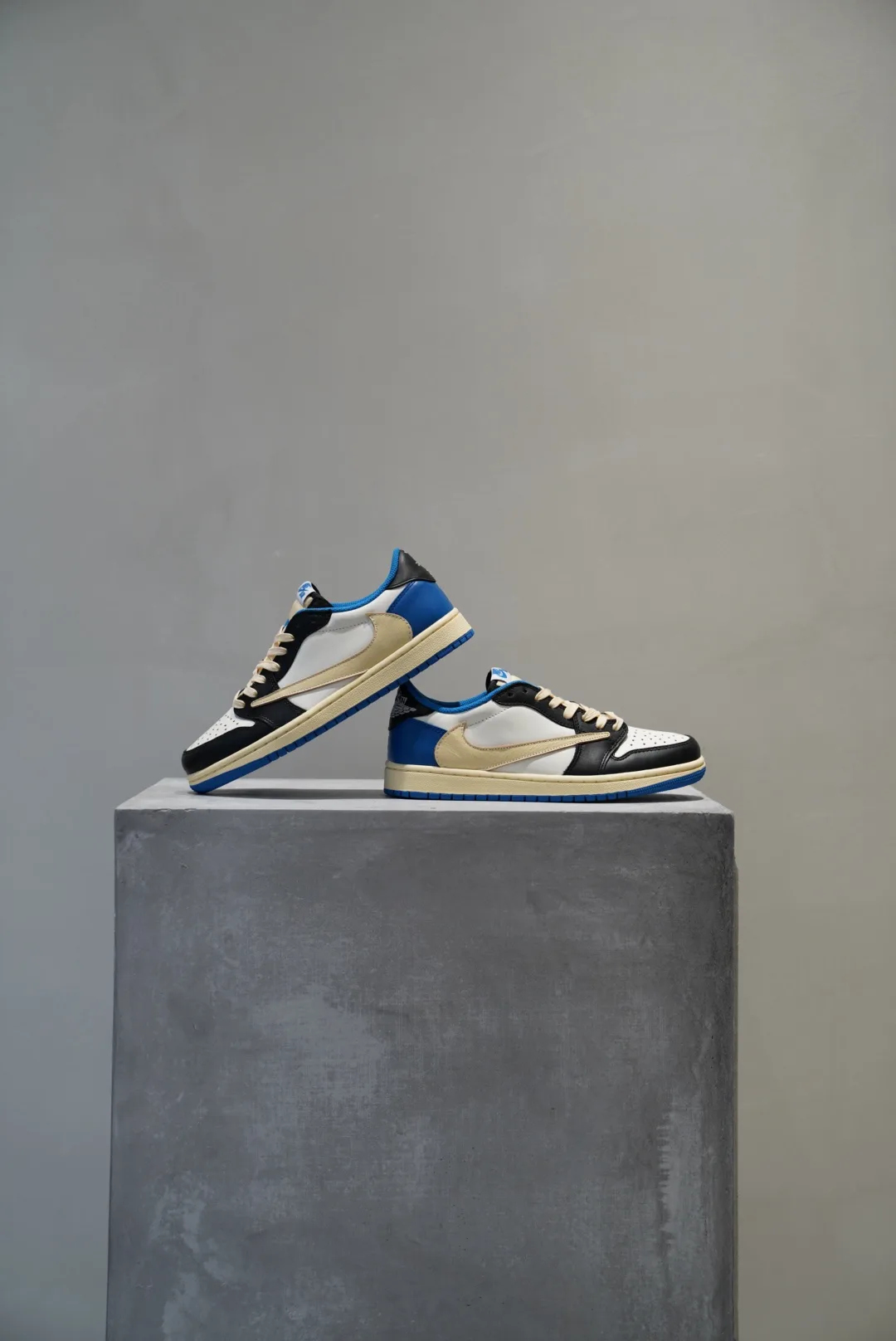 Travis Scott x Fragment x Air Jordan-Kollaboration: Nach dem Erfolg der Travis Scott- und Air Jordan-Serie mit dem umgekehrten Swoosh hat sich Mode-Pate Hiroshi Fujiwara zusammengetan, um eine neue, bahnbrechende Kollaboration zu starten. Der Schuh behält das ikonische Design des umgekehrten Swooshs bei und besticht durch ein Obermaterial aus weiß-blauem Narbenleder mit hochwertigem Tragegefühl. Zunge und Ferse jedes Schuhs sind mit dem charakteristischen Travis Scott- und Fragment-Schlaggesicht bzw. Blitz-Design versehen.