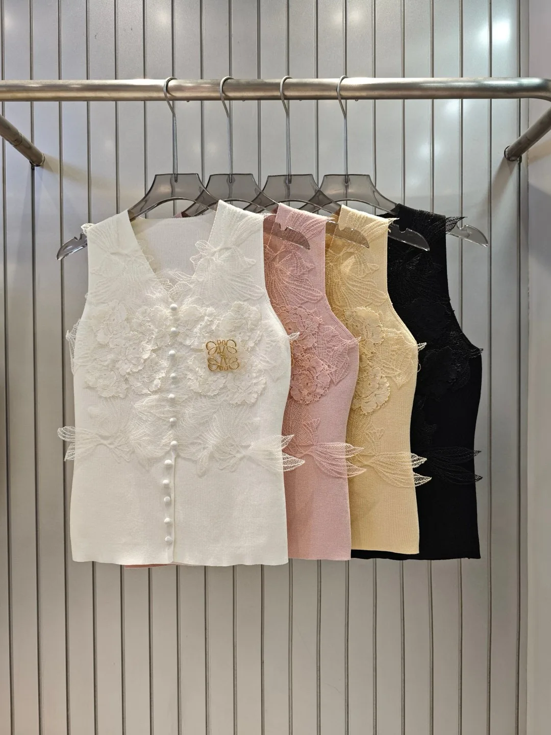 Loewe Strickweste mit V-Ausschnitt und Spitzenbesatz und Brosche