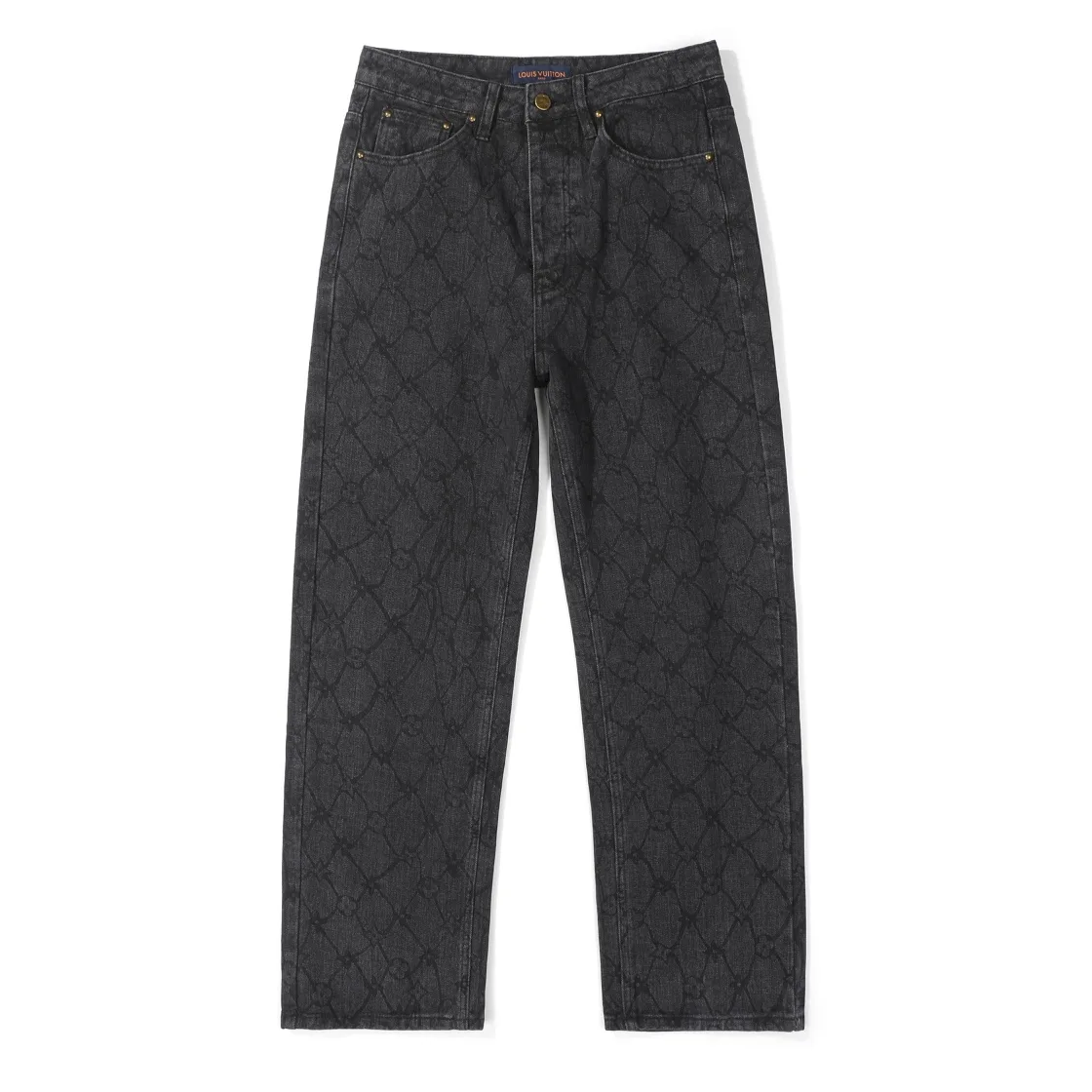 Louis Vuitton SS Prell Williams x V SS Damien Paris Fashion Show Herbst/Winter Jacquard-Jeans. Diese Jeans im Used-Look besticht durch eine netzartige Struktur und ein durchgehendes Damoflage-Jacquardmuster. Der Stoff wird in garngefärbter Jacquard-Technik hergestellt (gefärbt-gefärbt bedeutet, dass Garne vor dem Weben in verschiedenen Farben gefärbt werden). Das Sandwaschverfahren für japanischen Denim im Used-Look sorgt für einen eleganten, stylischen Look. Die anatomisch geformten Einsätze und die Seitenteile sind mit einem neuen perlenförmigen Knopfverschluss versehen. Die perlenförmigen Knöpfe sind deutlich graviert und im neuesten perlenförmigen Knopfdesign gestaltet. Luxuriös und stylisch – ein Must-have für Damen und Herren in diesem Jahr. Sehr empfehlenswert!