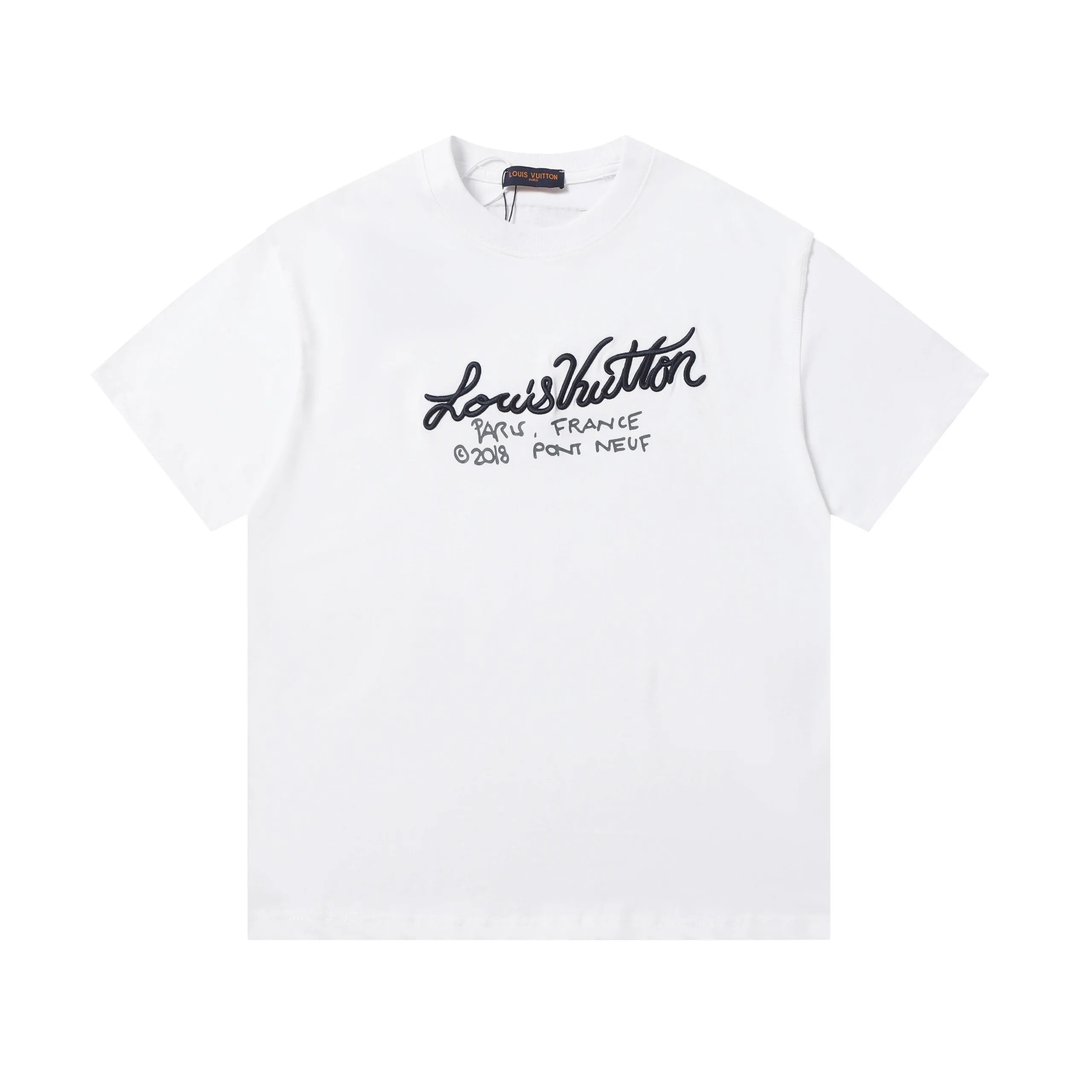 LOUIS VUITTON* Louis Vuitton Kurzarm-T-Shirt mit Stickerei. Hergestellt aus einem originalen, maßgeschneiderten Stoff aus 100 % Baumwolle. Außergewöhnlich weich und bequem. Hochwertiger Stoff, der einläuft, sich verformt und pillt. Aus 100 % Twill (Stoff und Garn werden im selben Bottich gefärbt, was Farbvariationen und hervorragende Formbeständigkeit gewährleistet). Mit Originalmuster, individuellen Besätzen, Kragenetikett, Pflegeetikett, Hängeetikett und detailverliebter Verpackung.