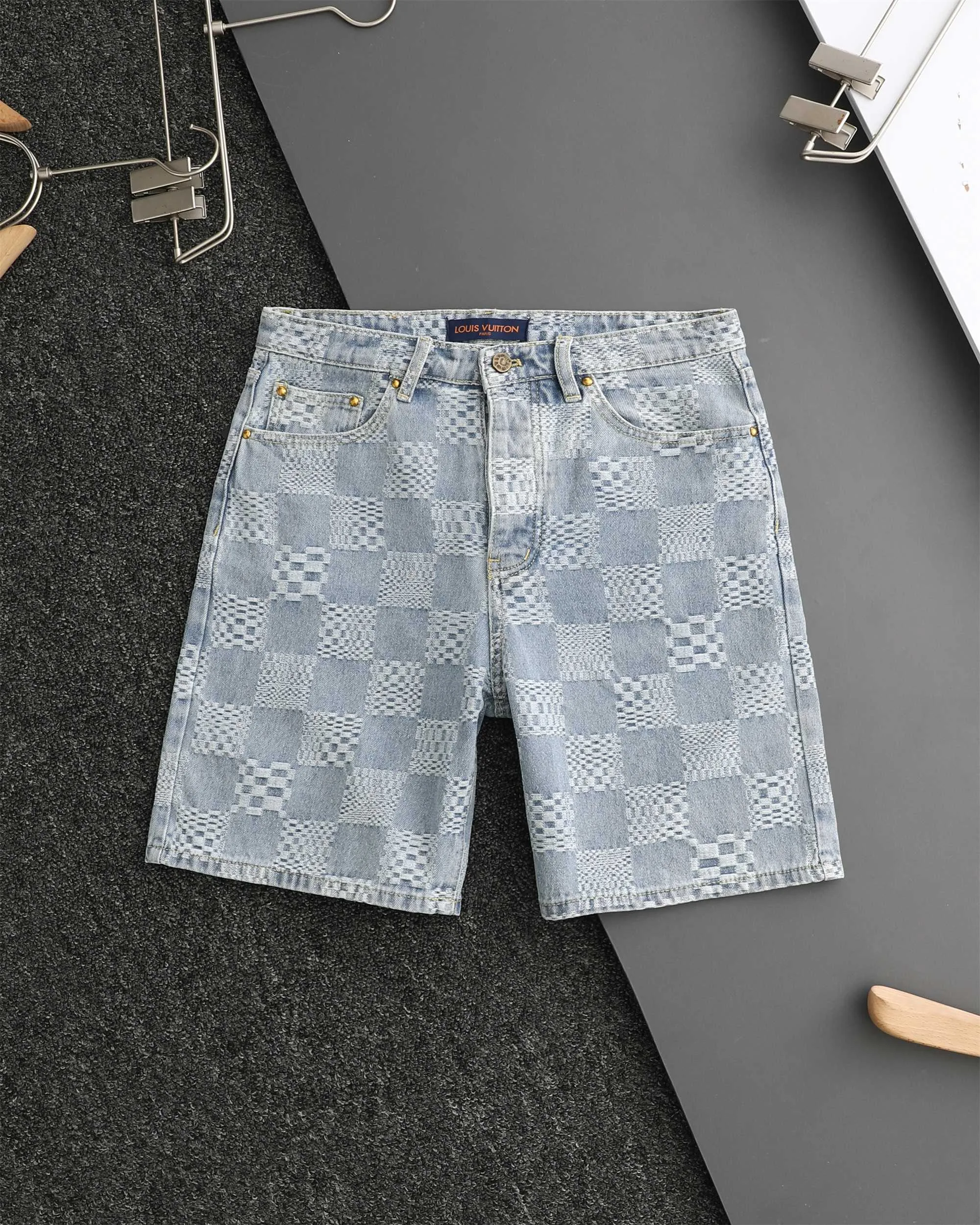 Louis Vuitton Donkey Brand Frühjahr/Sommer: Jeansshorts mit Schachbrettmuster und Allover-Logo-Print. Erhältlich auf der offiziellen Website. Ein beliebtes Set.