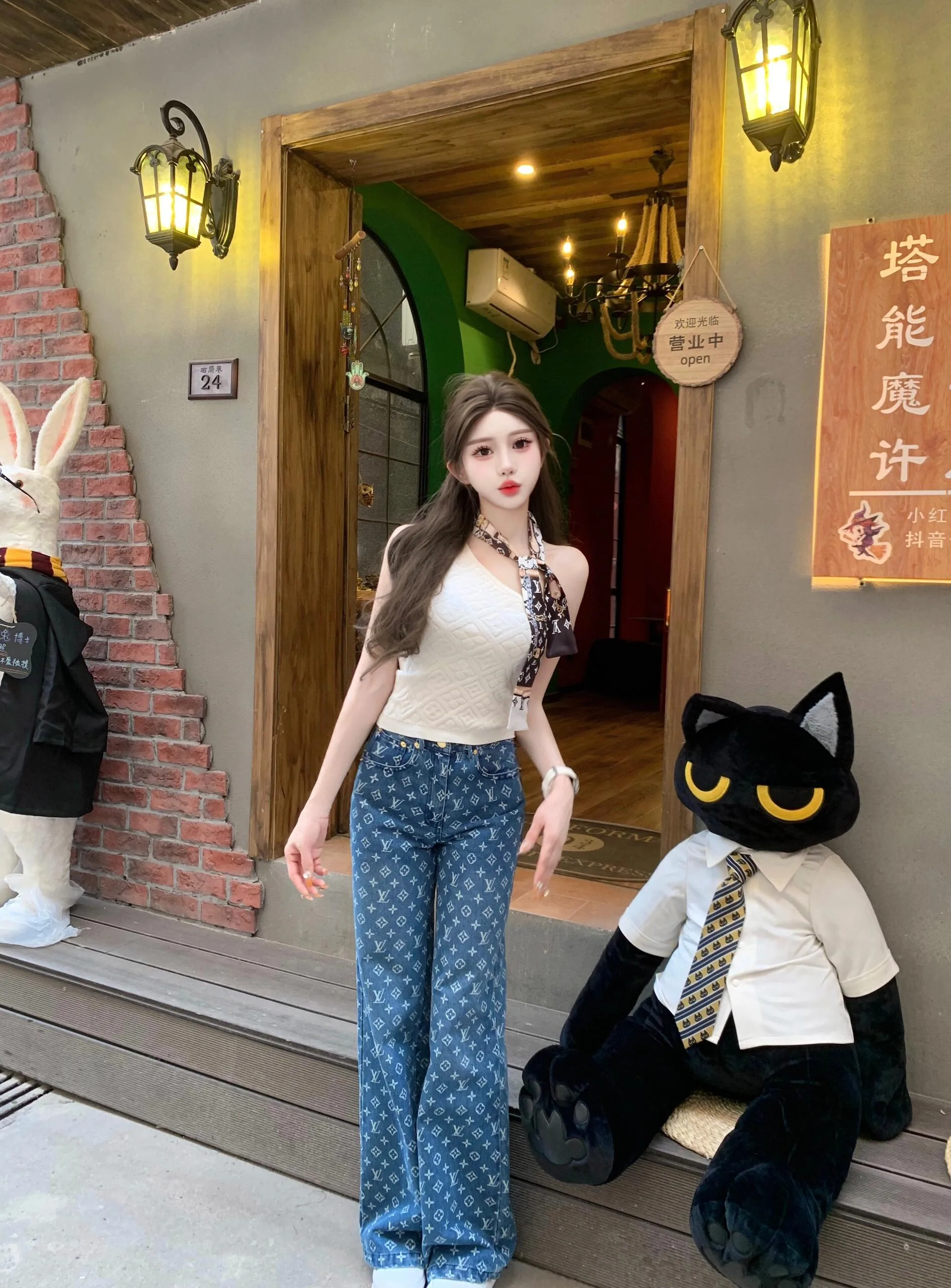 Louis Vuitton LV schulterfreie Strickweste aus Jacquard mit Diamantprägung und vierblättrigem Kleeblatt und Seidenschal