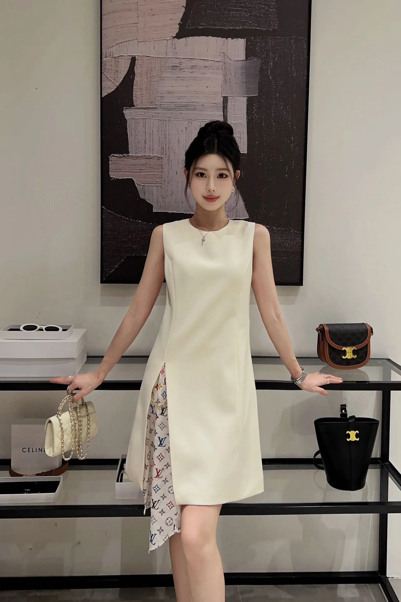 Louis Vuitton LV – Farbenfrohes, monochromes Tank-Kleid mit vierblättrigem Kleeblatt-Print, Ketteneinsatz und Schlitz