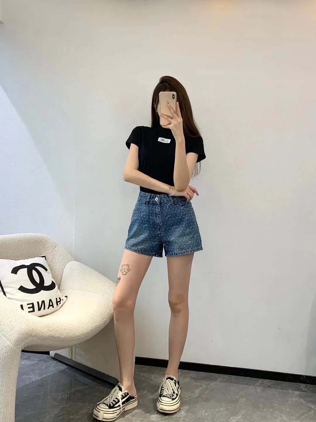 miumi Miu Miu SS Neues High-End-Produkt ~ Superstylischer neuer Print-Denim mit Monogramm-Prints. Die einzigartige, fermentierte Waschung wirkt cool und stylisch. Der Stoff aus hochwertigem, gewaschenem Baumwoll-Twill-Denim bietet eine feine Textur und ein natürliches Baumwollgefühl für ein glattes und dennoch weiches Tragegefühl. Die fermentierte Waschung ist ein klassischer, vielseitiger Farbton für einen atemberaubenden Look! Die Details sind außergewöhnlich gut verarbeitet.