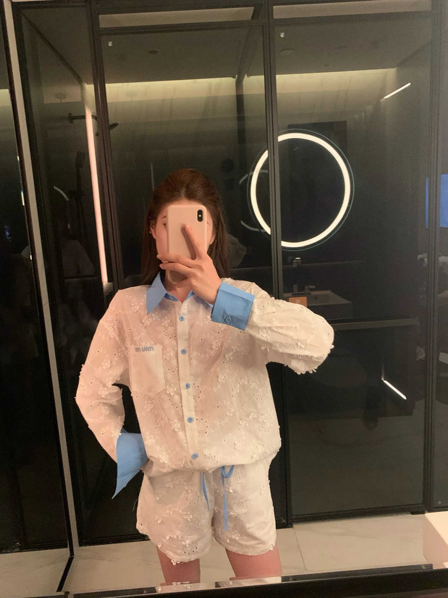 Miumiu Miu Miu Set aus Hemd und Shorts mit Monogramm, Lochstickerei und Kontrastfarbe