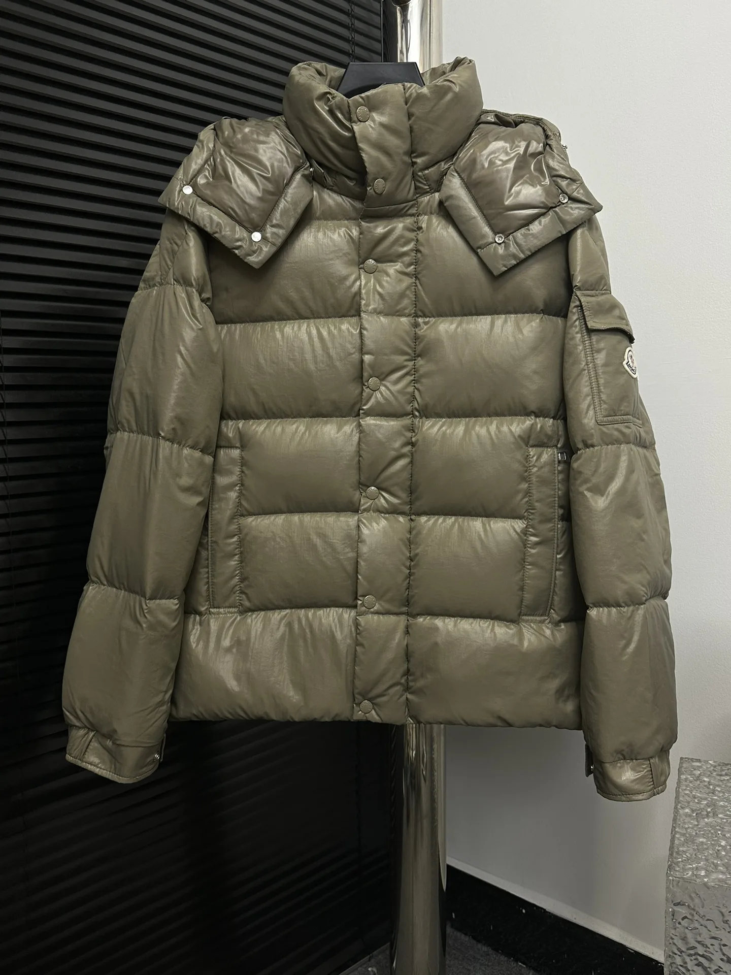 Moncler Maya klassische Daunenjacke mit glänzendem Finish und kleinem Logo, mit Manschettentaschen und abnehmbarer Kapuze. Maßgefertigter Stoff, identisch mit dem Original, mit lackiertem Glanzfinish und wasserdichter Beschichtung. Maßgefertigte Accessoires mit drei Logos und maßgefertigten Logoknöpfen.